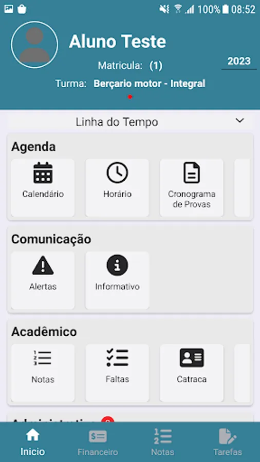 Announcements, News, Events, School Calendar, Finance with issue of Boletos, Notes, Frequency, Occurrences, Tasks, Contents, Exclusive area for Teacher publications, in addition to a Timeline that shows upcoming events are functions found in this application.
