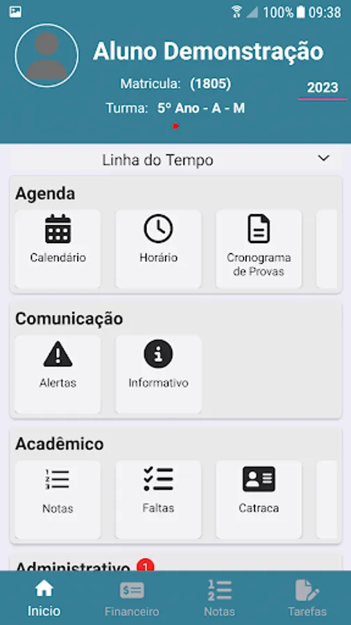Announcements, News, Events, School Calendar, Financial with issuance of Billets, Notes, Frequency, Occurrences, Tasks, Contents, Exclusive area for Teacher publications, in addition to a Timeline that shows the next events are functions found in this application.