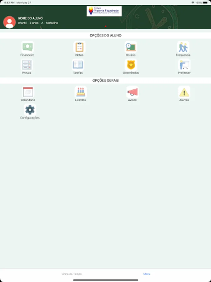 Announcements, News, Events, School Calendar, Financial with the issuance of Billets, Notes, Frequency, Occurrences, Tasks, Contents, Exclusive area for Teacher publications, in addition to a Timeline that shows the next events are functions found in this application.