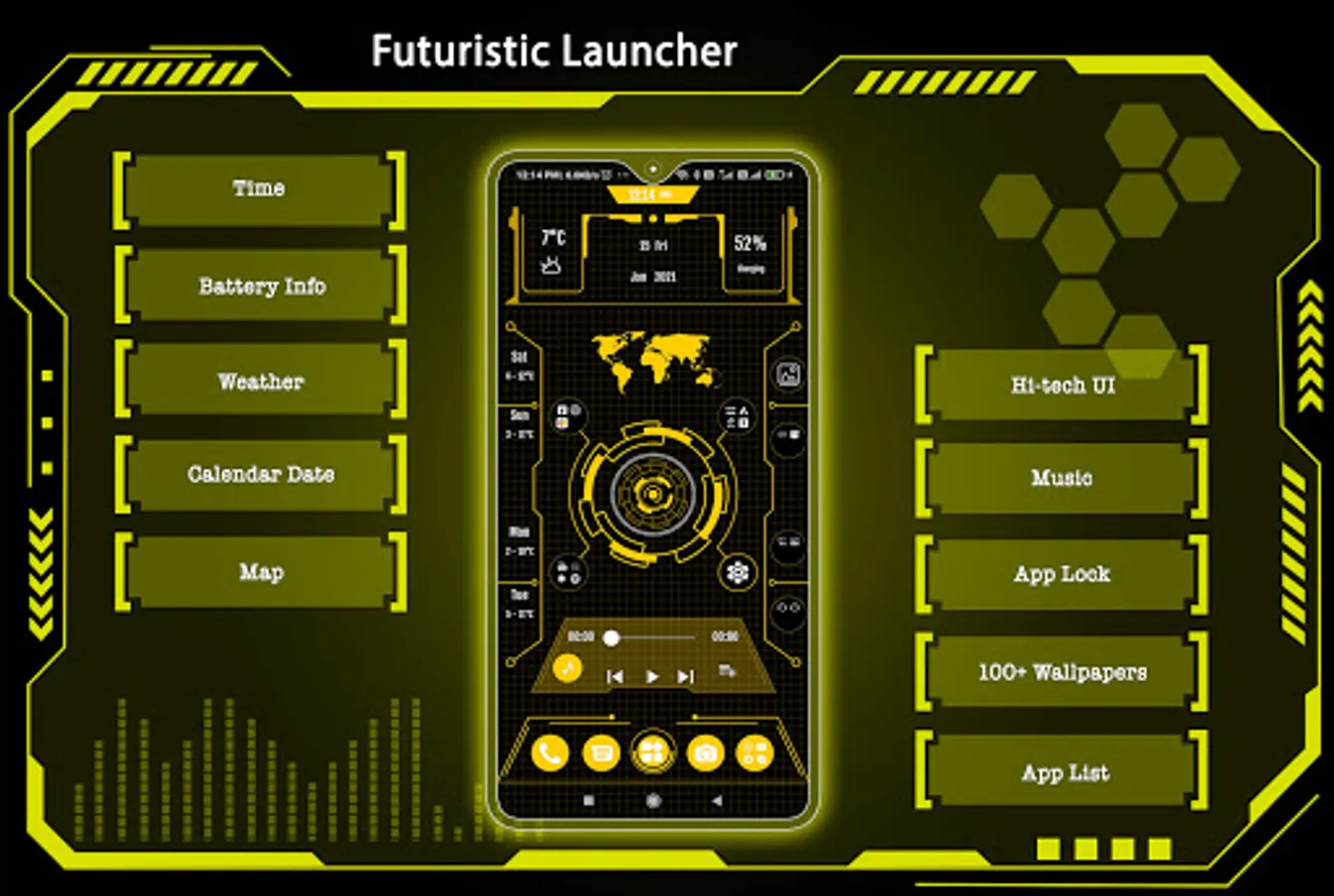 Welcome to Futuristic Launcher, your gateway to a seamless and stylish Android experience. Unlock the power of AppLock, HideApp, Hitech Wallpaper, Folders, and Themes - all in one incredible package. With its futuristic UI, customizable themes, and powerful features, Futuristic Launcher is the perfect way to make your Android phone feel like a brand new device. This is a perfect user interface design which gives user to easy and better interactive control experience. It provides more wonderful and useful features and any color themes which enhance your phone with different styles.