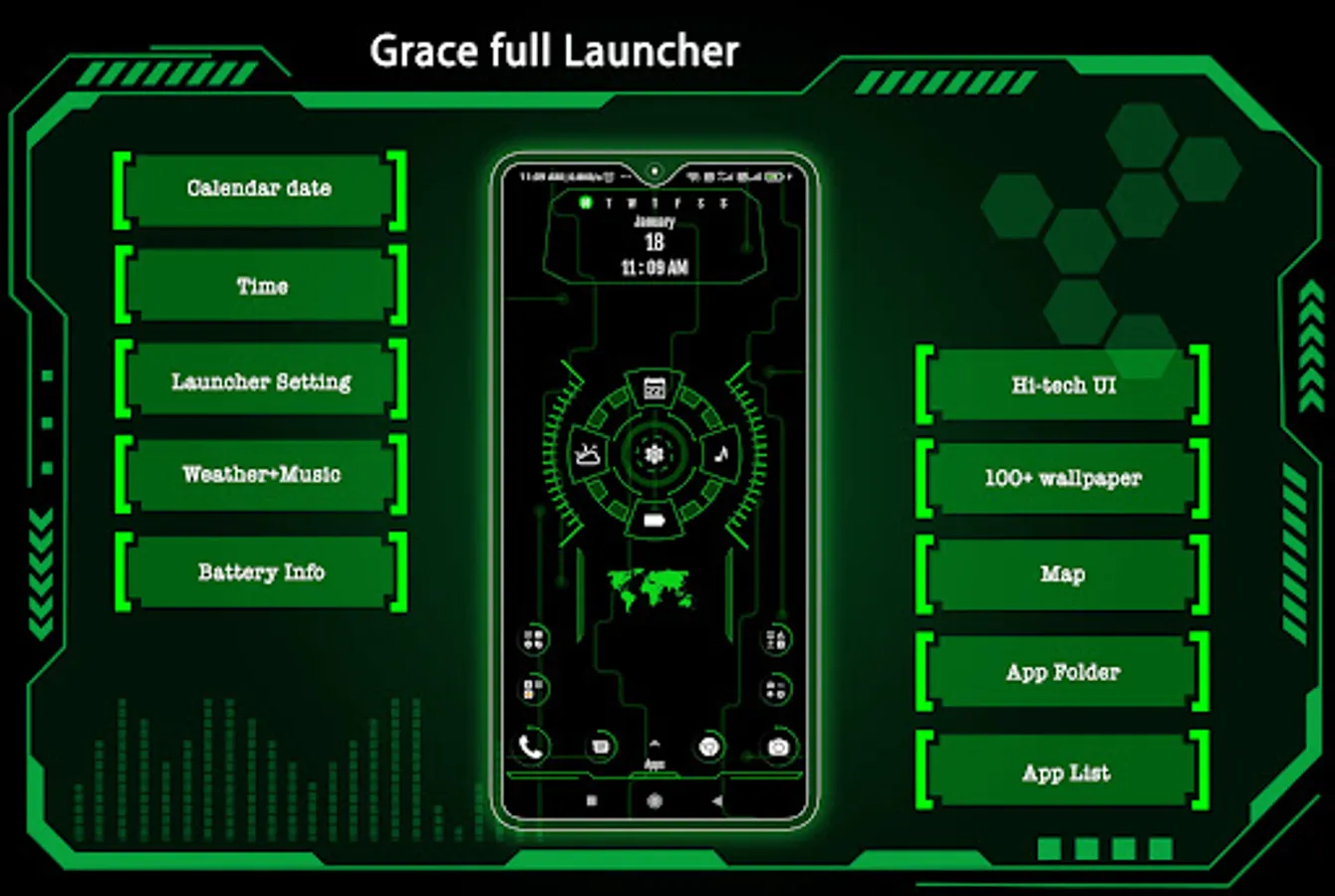 Welcome to Grace full Launcher, your gateway to a seamless and stylish Android experience. Unlock the power of AppLock, HideApp, Hitech Wallpaper, Folders, and Themes - all in one incredible package. With its futuristic UI, customizable themes, and powerful features, Grace full Launcher is the perfect way to make your Android phone feel like a brand new device. This is a perfect user interface design which gives user to easy and better interactive control experience. It provides more wonderful and useful features and any color themes which enhance your phone with different styles.