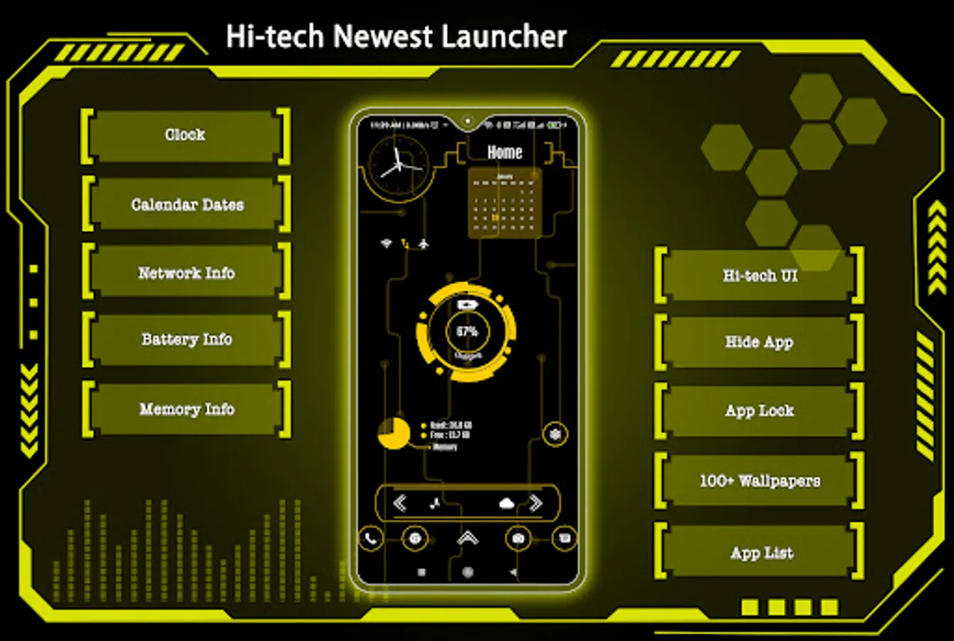 Welcome to Hi-tech newest launcher, your gateway to a seamless and stylish Android experience. Unlock the power of AppLock, HideApp, Hitech Wallpaper, Folders, and Themes - all in one incredible package. With its futuristic UI, customizable themes, and powerful features, Hi-tech newest launcher is the perfect way to make your Android phone feel like a brand new device. This is a perfect user interface design which gives user to easy and better interactive control experience. It provides more wonderful and useful features and any color themes which enhance your phone with different styles.