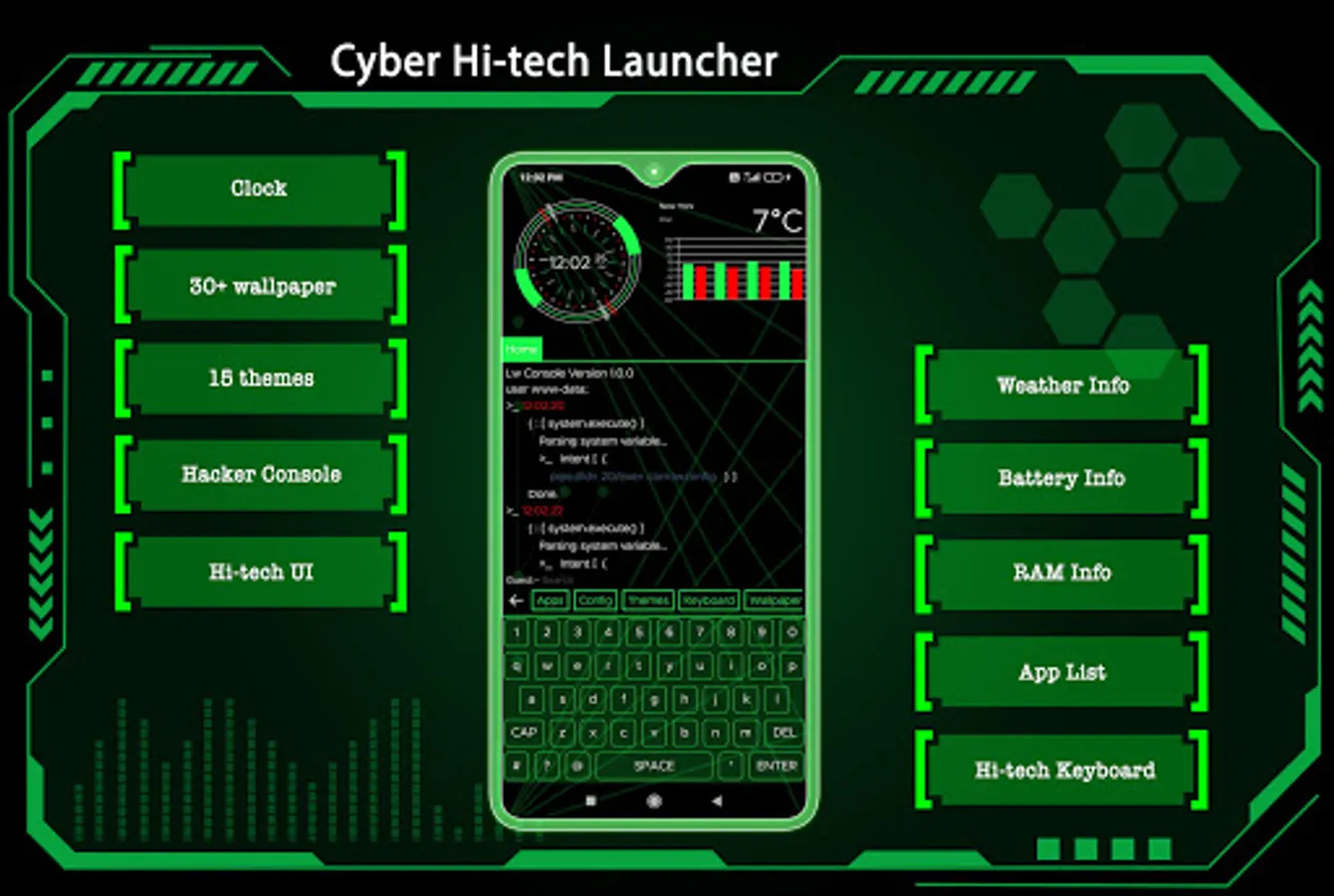 Cyber Hi-tech Launcher 2023 - AppLock, HideApp, Hitech Wallpaper, Folder and Themes easy to use, stylish and offers higher performance. It stylized your phone’s home screen in future UI which gives a next generation launcher and virtual theme to your android phone.