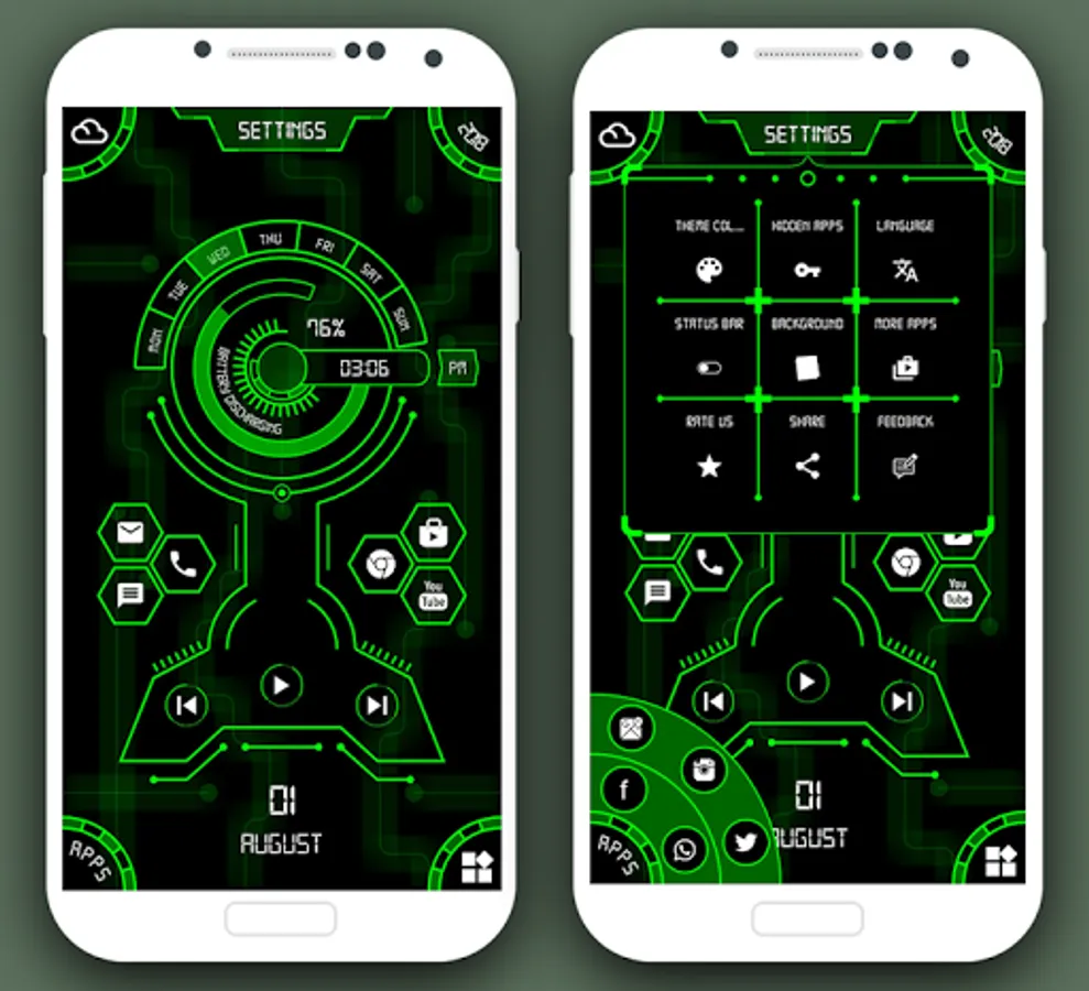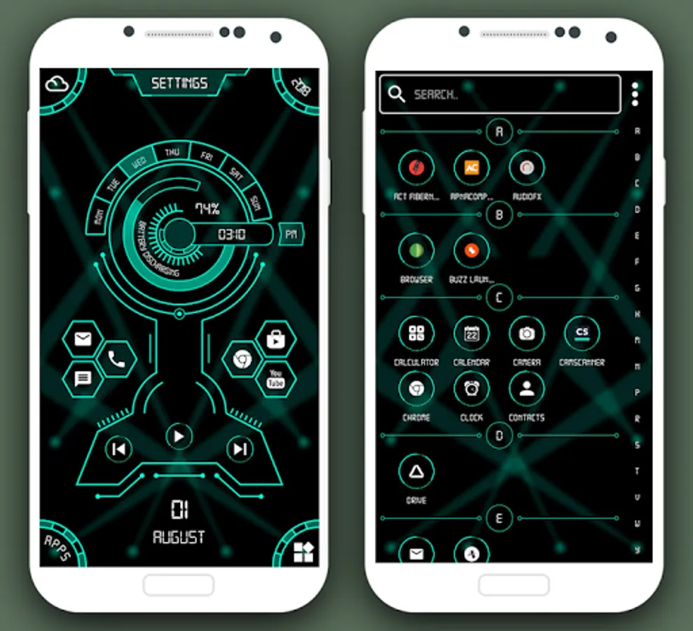 Immerse yourself in a world of color with millions of theme color options. Watch as your entire launcher transforms to exude a futuristic hitech vibe.