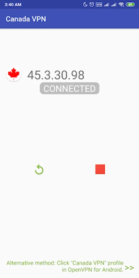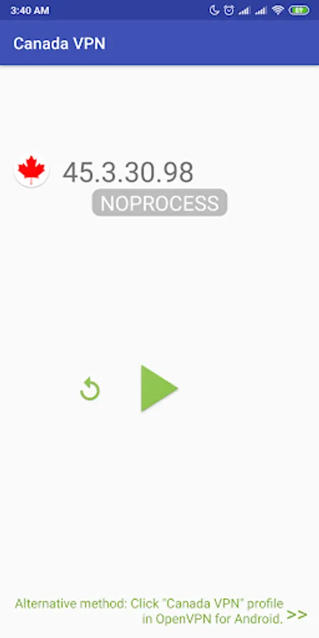 3. Click on "Play" button , the IP address of OpenVPN profile will be save, import and start to connect to the server by pass command to "OpenVPN For Android" app.