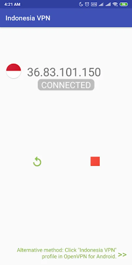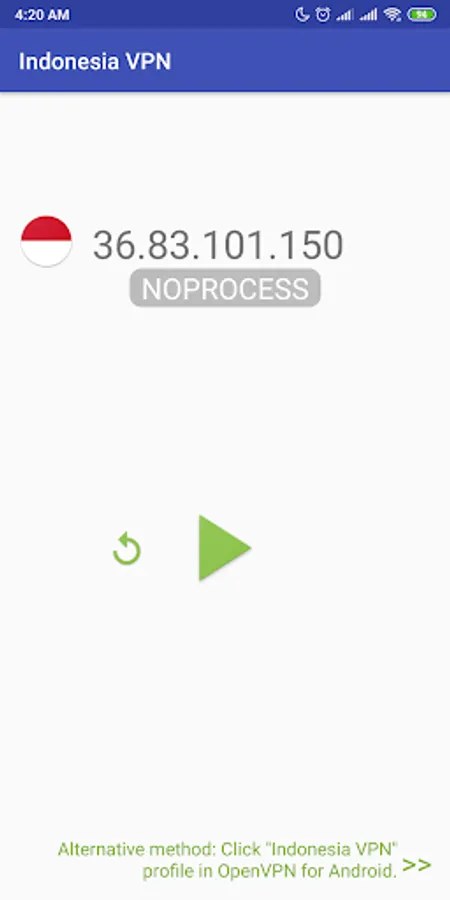 3. Click on "Play" button , the IP address of OpenVPN profile will be save, import and start to connect to the server by pass command to "OpenVPN For Android" app.