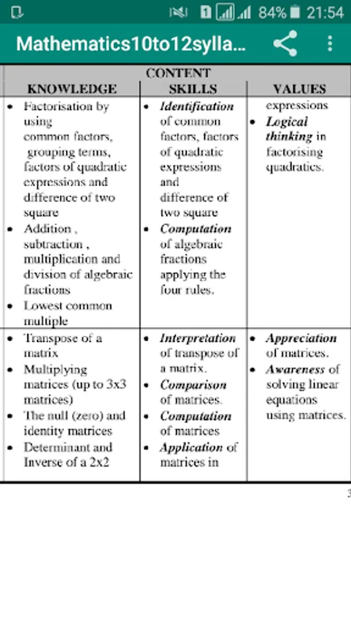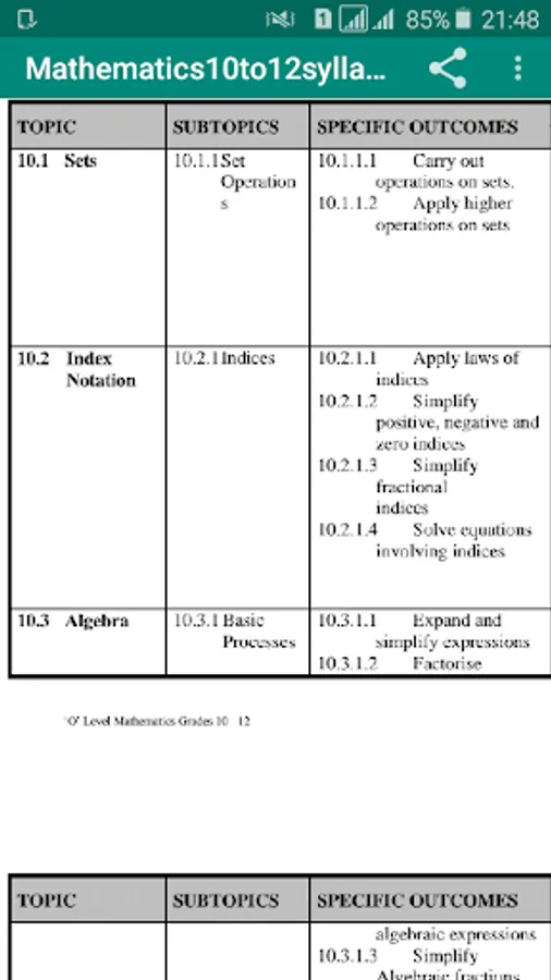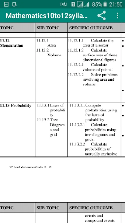 These syllabus guidelines have been defined at two levels namely the content and process domains. The content domain is defined according to seven themes namely; Numbers & Calculations, Algebra, Geometry, Computers, Measures, Probability & Statistics and Relations. The process domain on the other hand is defined according to three categories of knowledge, skills and values. These two domains constitute the general outcomes of the Mathematics course.