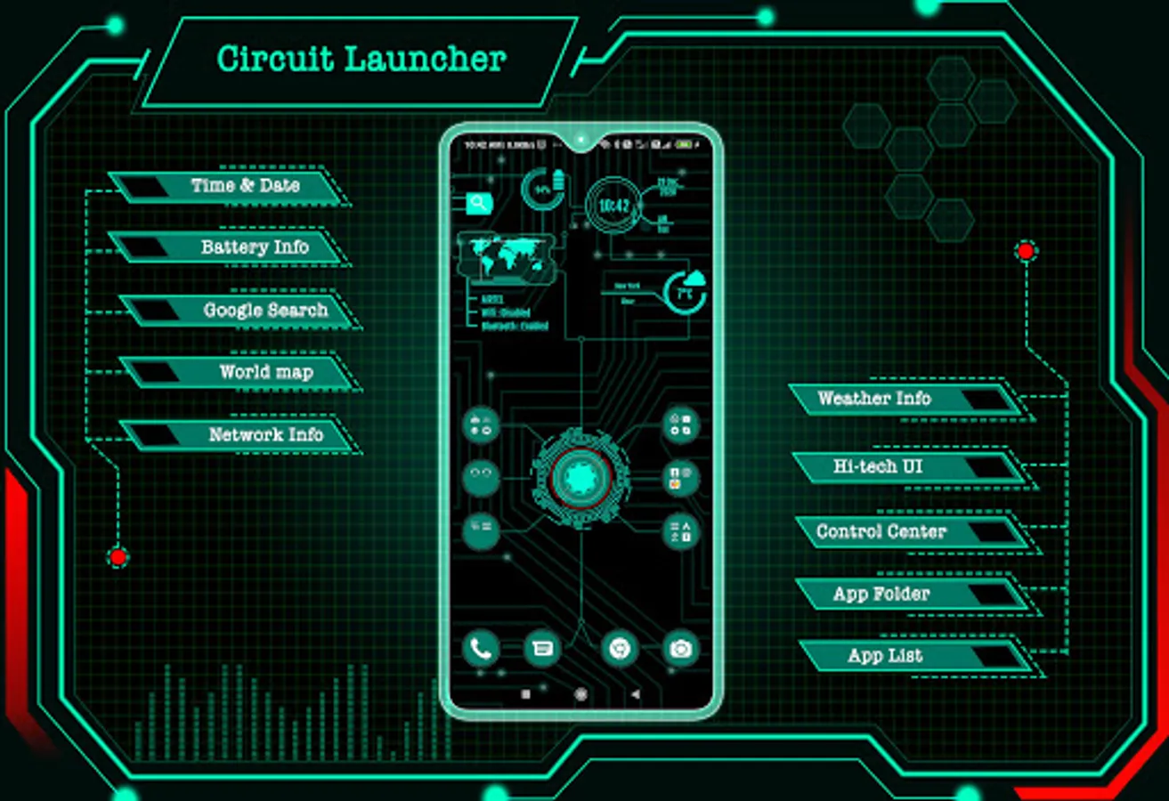 Circuit Launcher is a fast and easy-to-use launcher for Android, designed with a future UI or next-generation UI style, with its extensive customization options. This app turns your Android phone into a futuristic launcher. It lets you say goodbye to outdated launchers and welcome the new and improved Circuit Launcher - AppLock, HideApp, Hitech Wallpaper, Folder, and Themes. With this app.