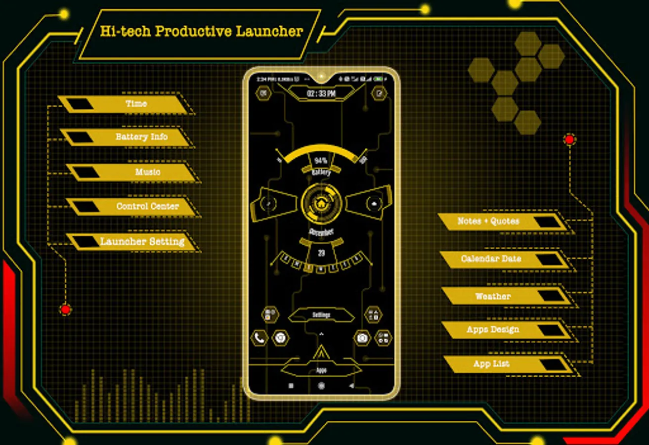 Hi-tech productive launcher is a fast and easy-to-use launcher for Android, designed with a future UI or next-generation UI style, with its extensive customization options. This app turns your Android phone into a futuristic launcher. It lets you say goodbye to outdated launchers and welcome the new and improved Inventive Launcher - AppLock, HideApp, Hitech Wallpaper, Folder, and Themes. With this app.