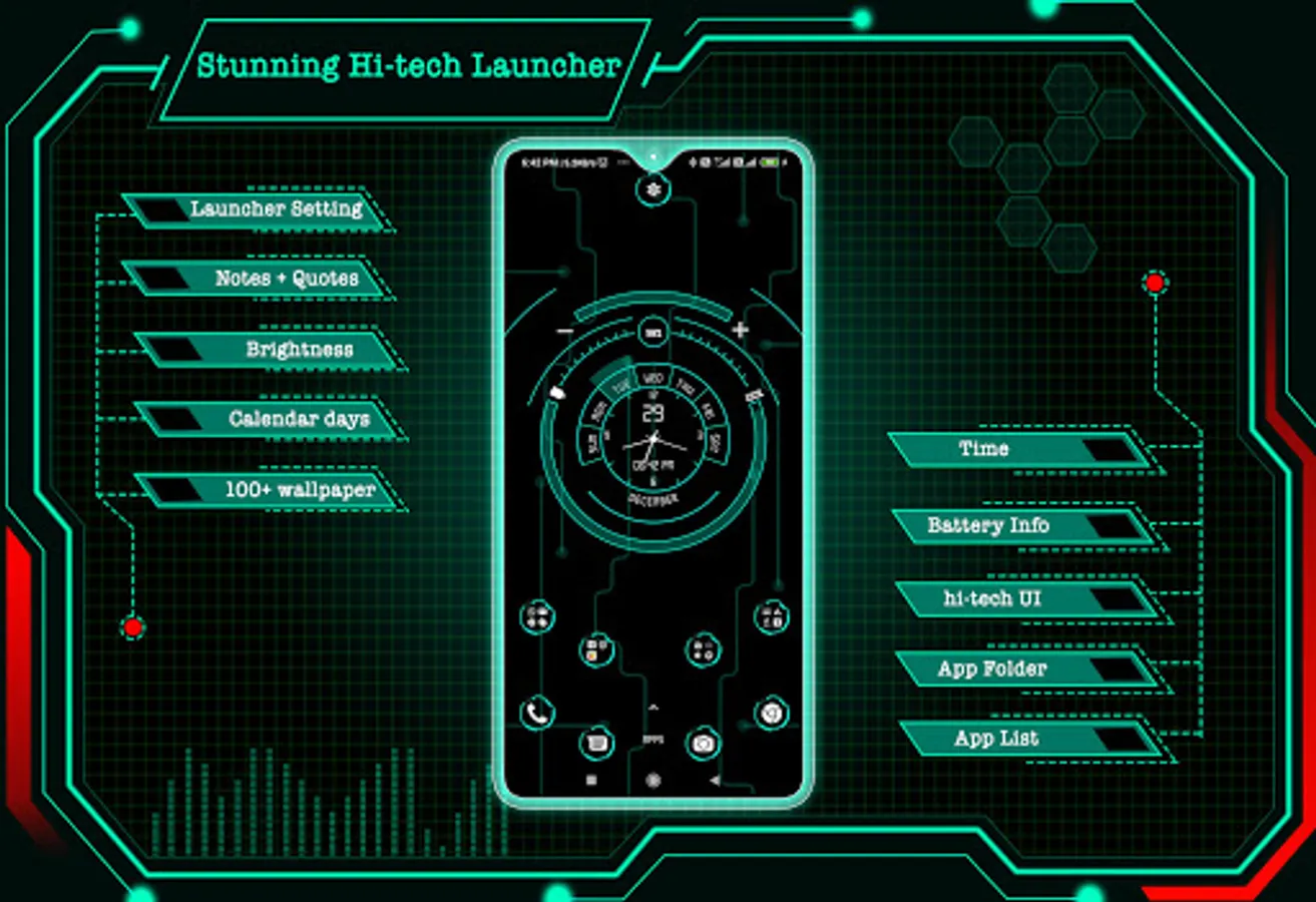 Hitech stunning launcher - AppLock, HideApp, Hitech Wallpaper, Folder and Themes easy to use, stylish and offers higher performance. It stylized your phone’s home screen in future UI which gives a next generation launcher or virtual theme to your android phone.
