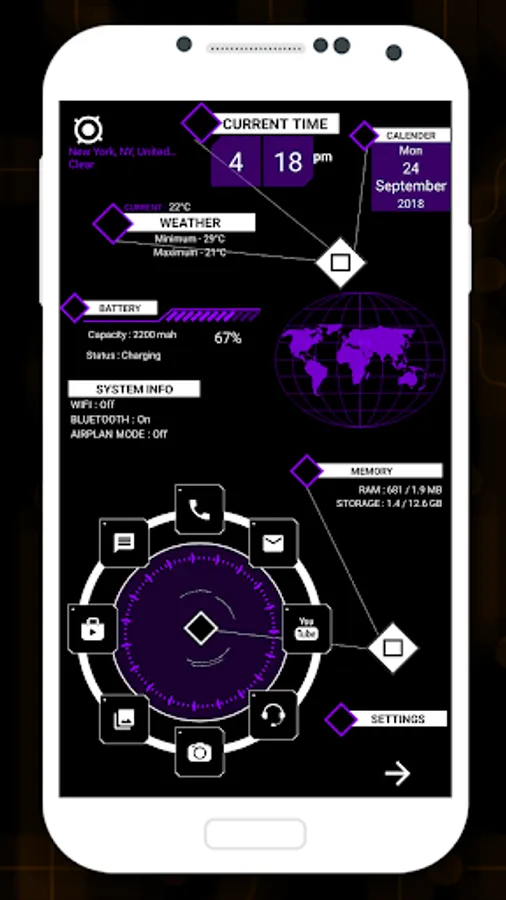 Enjoy the Hi-tech wallpaper feature that adapts its color to match your chosen theme. You can also adjust the brightness of the wallpaper or apply your own images from the gallery.