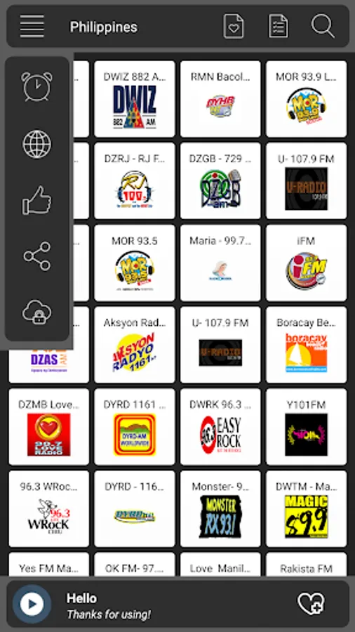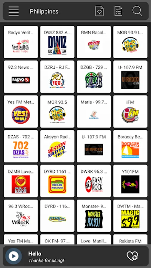 Kabilang sa Pilipinas Radio ang lahat ng istasyon ng radyo ng Pilipinas para sa mas mabilis, mas madaling pakikinig at libre. Sa Pilipinas Radio maaari mong mabilis na tangkilikin ang iyong mga paboritong radios sa pamamagitan ng iba't ibang mga kategorya (ng tunog, alternatibong, blues, klasiko, Kristiyano, bansa, sayaw, maraming hilig, hardcore, mga bata, pop, sports ...) sa isang pag-click, instant playback at kalidad ng kalidad . Walang mga headphone na kailangan lamang ng koneksyon sa network.