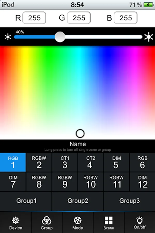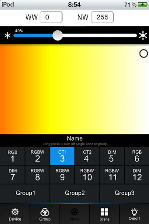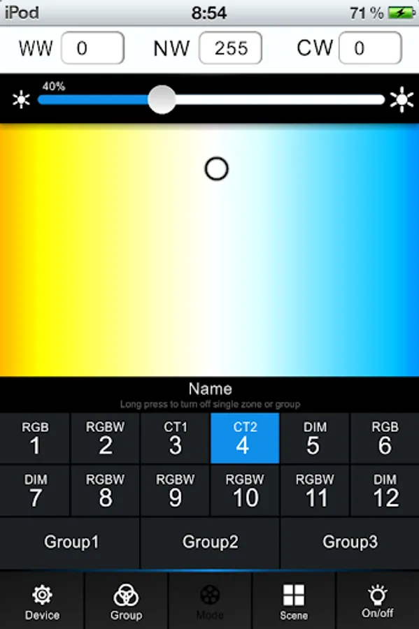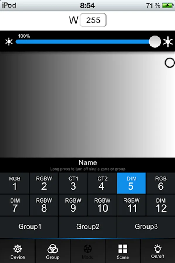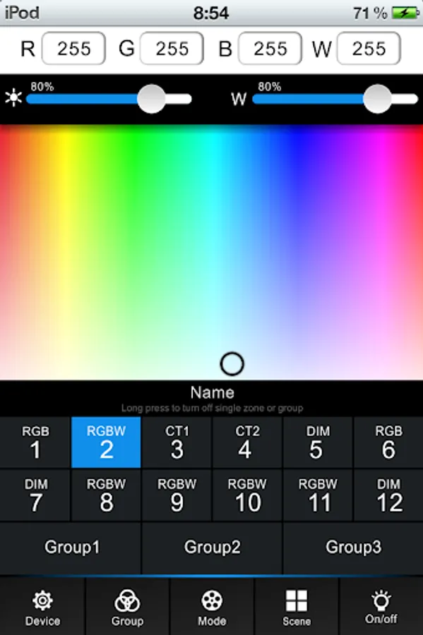 The software supports 12 zone control, Each zone can set to one of the five kinds of LED lights:. DIM (W), CT1 (NW + WW), CT2 (NW + WW + CW), RGB and RGBW Each zone can save or load maximum four scenes.