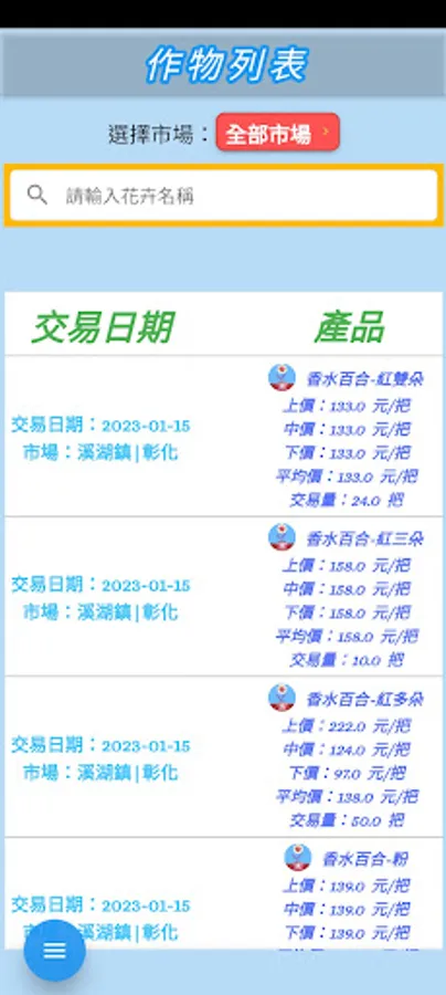 A small tool for inquiring about the wholesale market of agricultural products, and obtain the latest wholesale market prices of flowers through the open information of the Council of Agriculture.