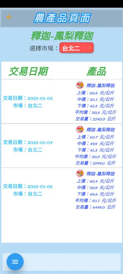 A small tool for inquiring about the wholesale market of agricultural products. It can obtain the latest prices in the fruit wholesale market through the open information of the Council of Agriculture.
