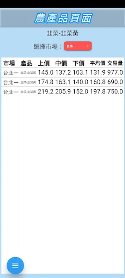 A small tool for inquiring about wholesale market prices of agricultural products, and obtains the latest vegetable wholesale market prices through the open information of the Council of Agriculture.