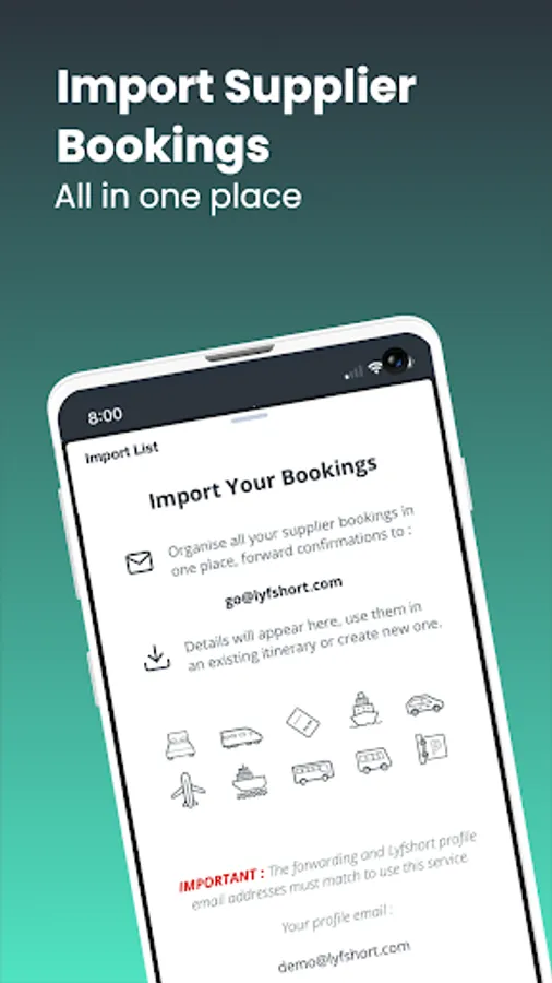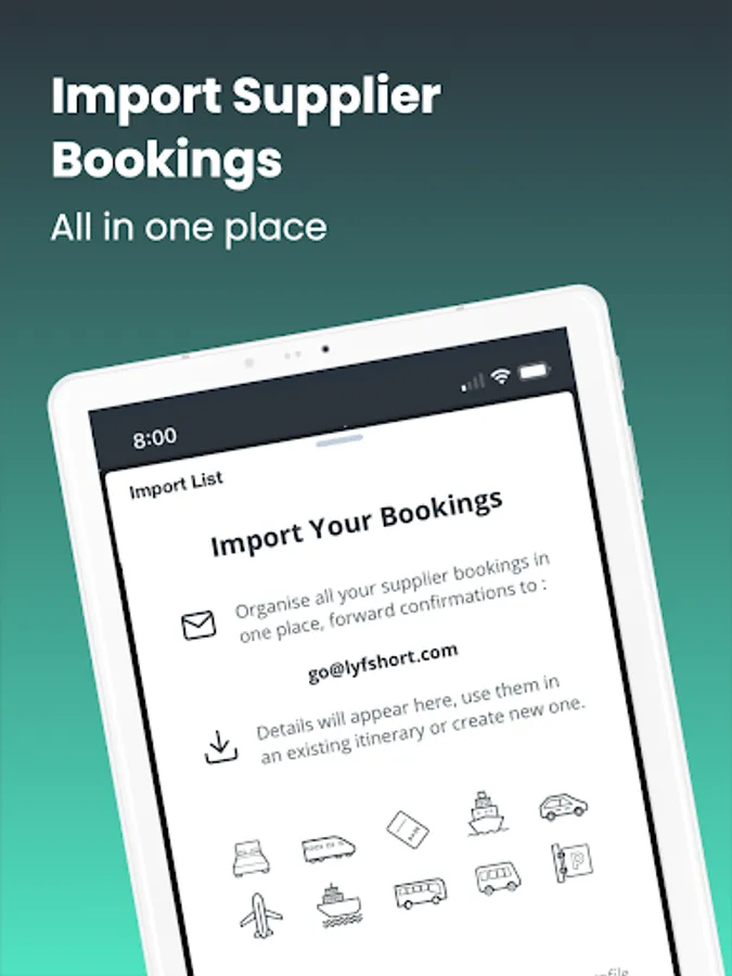Start planning by adding a list of things you want to do as itinerary items or Import existing bookings from different suppliers as items by sending supplier email confirmations to go@lyfshort.com ... Catch a flight? stay in accommodation? meet friends? Sight See? Go for drinks? Hire a Car? etc.