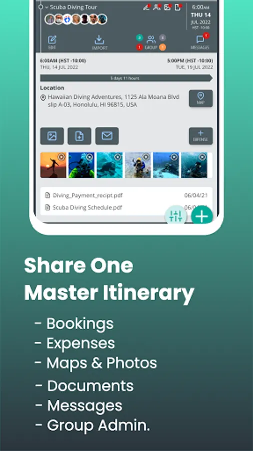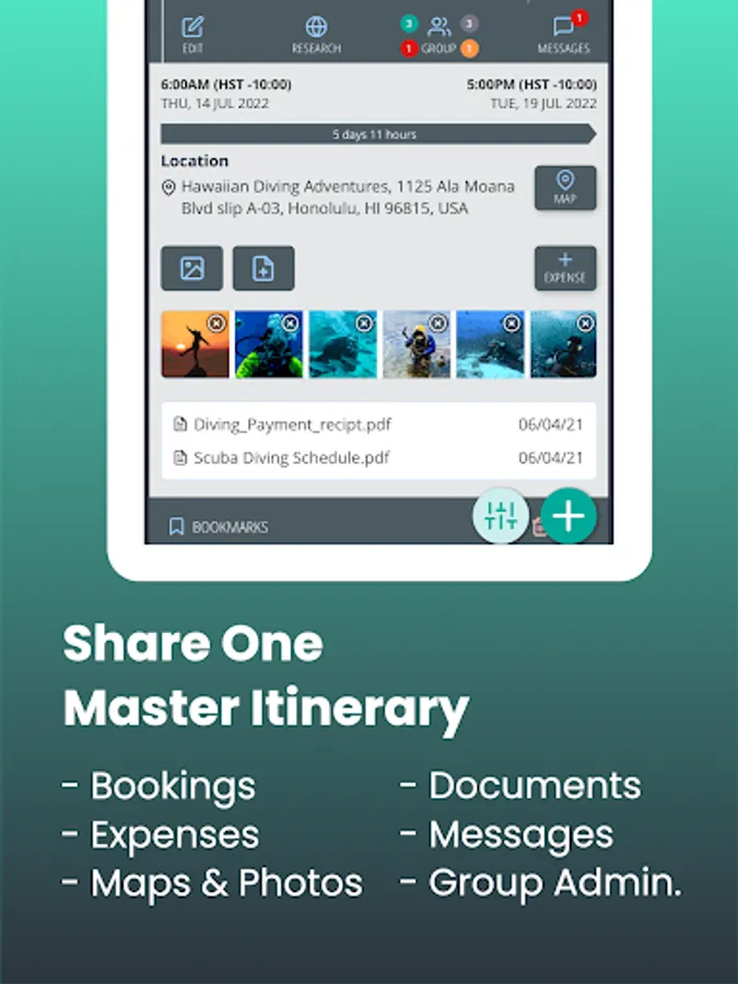 Efficiently manage your online research, times, dates & time zones, location mapping, budgeting and expense tracking, supplier bookings, group participants, photo and PDF sharing, messaging and communication, all in one place.