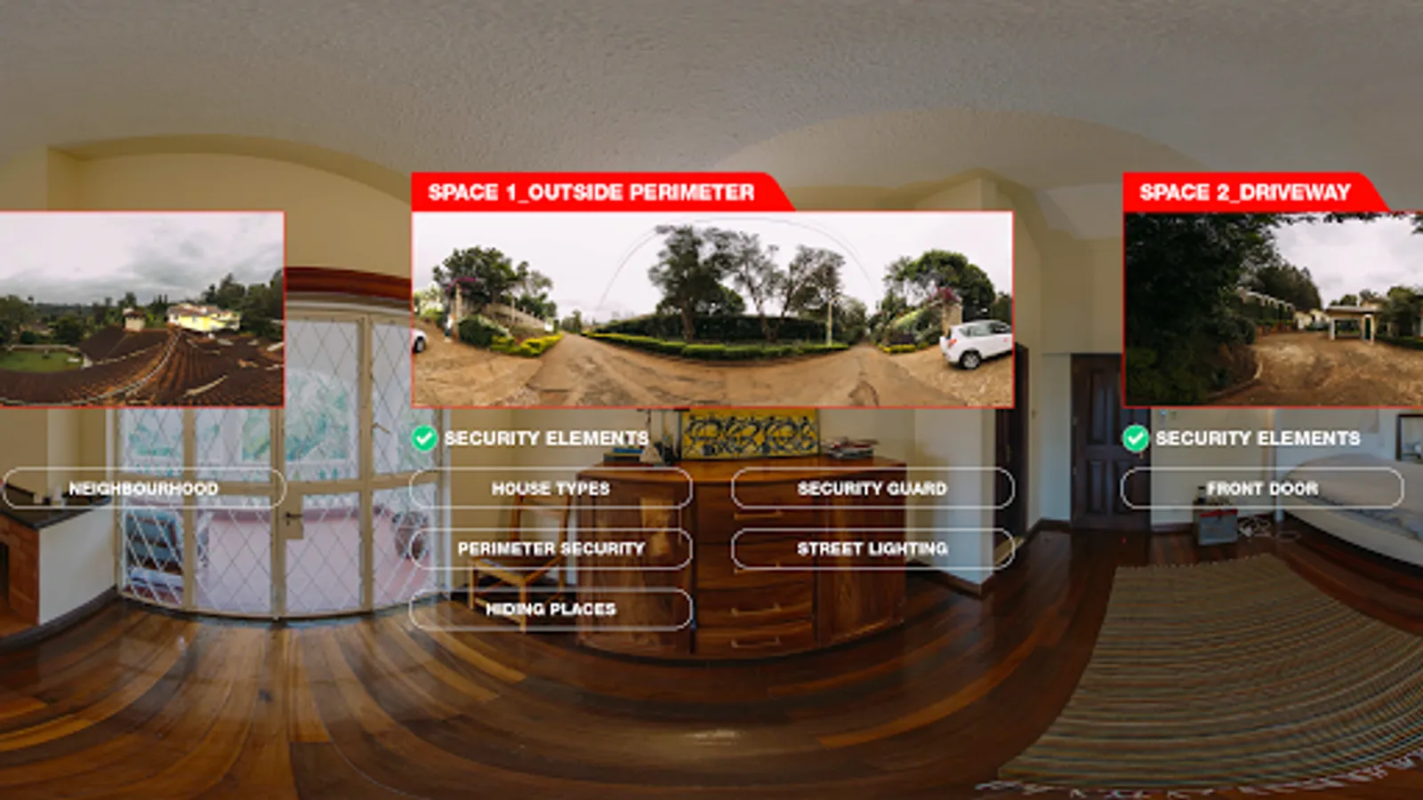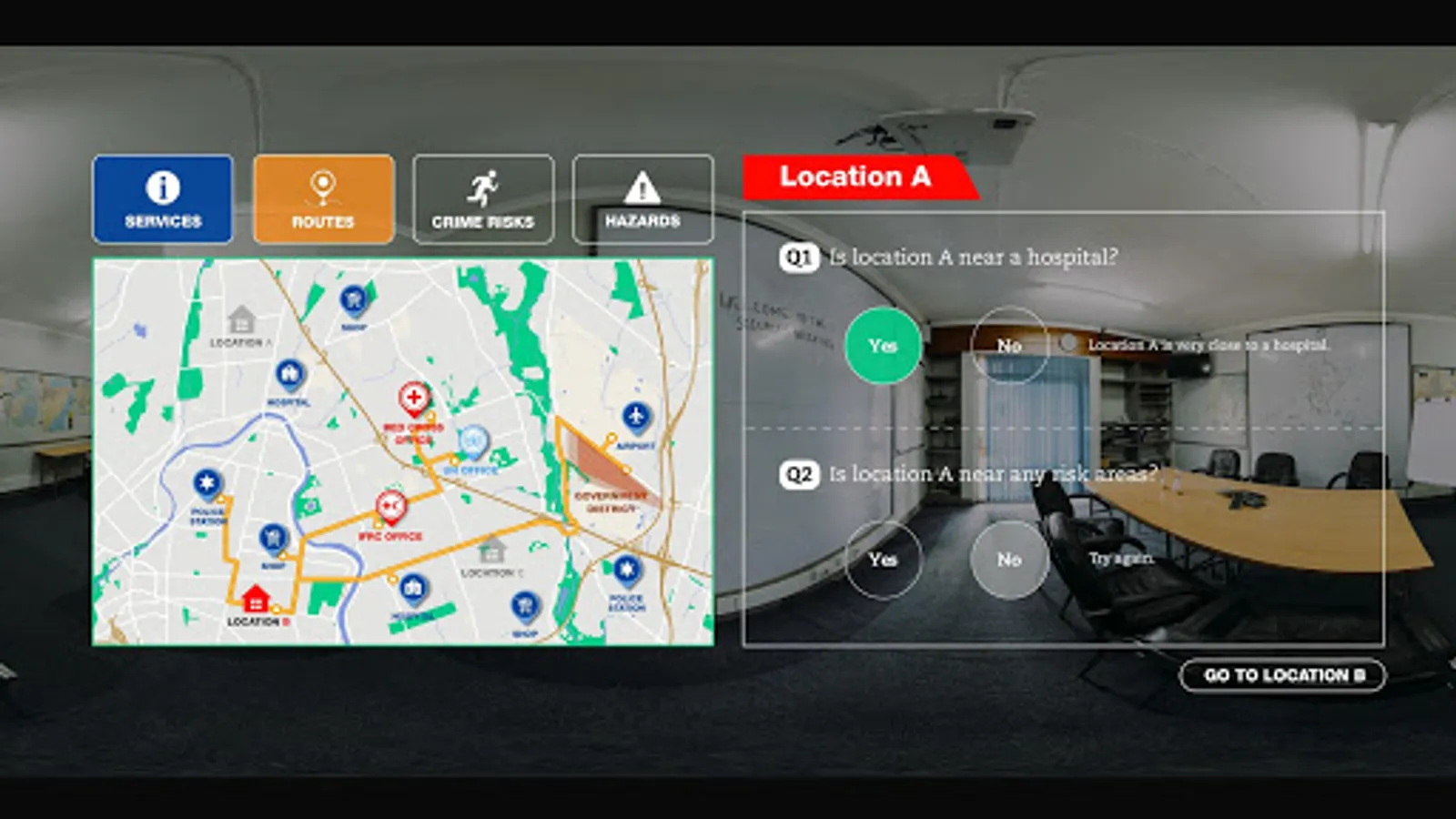 Stay Safe VR is an interactive VIrtual Reality learning environment, where the user is thrown into a real-life situation, where they have to complete a location safety and security assessment. The product is the first ever Virtual Reality learning environment in the global security training course, that all Red Cross staff working out on the field, are required to complete.