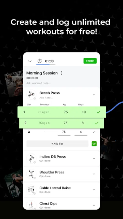 Gone are the days of trying to remember what weights you used or how many reps you did. With Lyfta, you can enter the weight and number of reps for each set one at a time or all at once with one click. Your data will be saved and tracked so that you can view the outcomes of your training in easy-to-understand charts and statistics.
