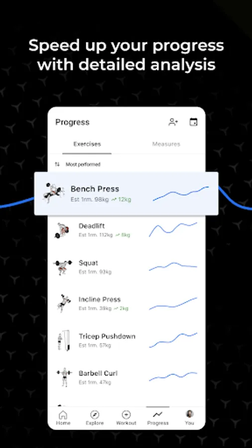 • Monitor your progress with detailed graphs for repetitions, volume, and estimated 1 repetition max.