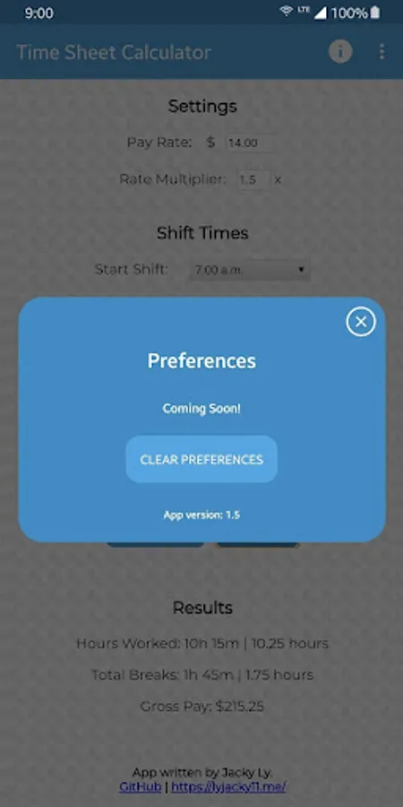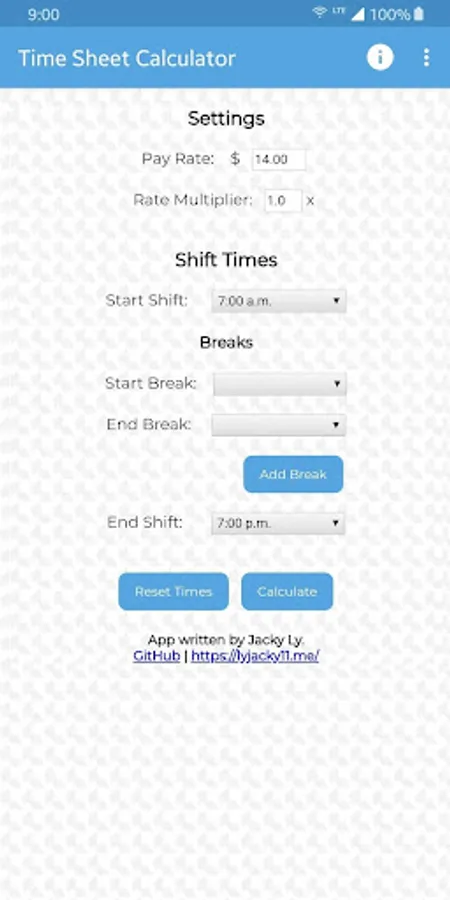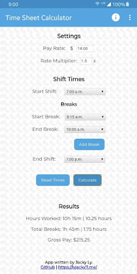 This app calculates the number of hours worked based on the start and end times of the shift and any break times. This is an open-source application and source code available on GitHub.