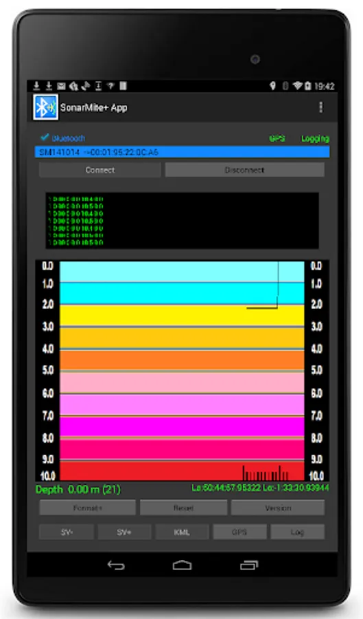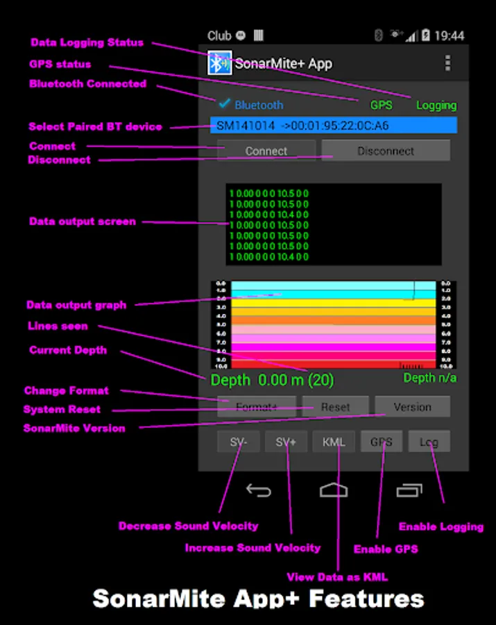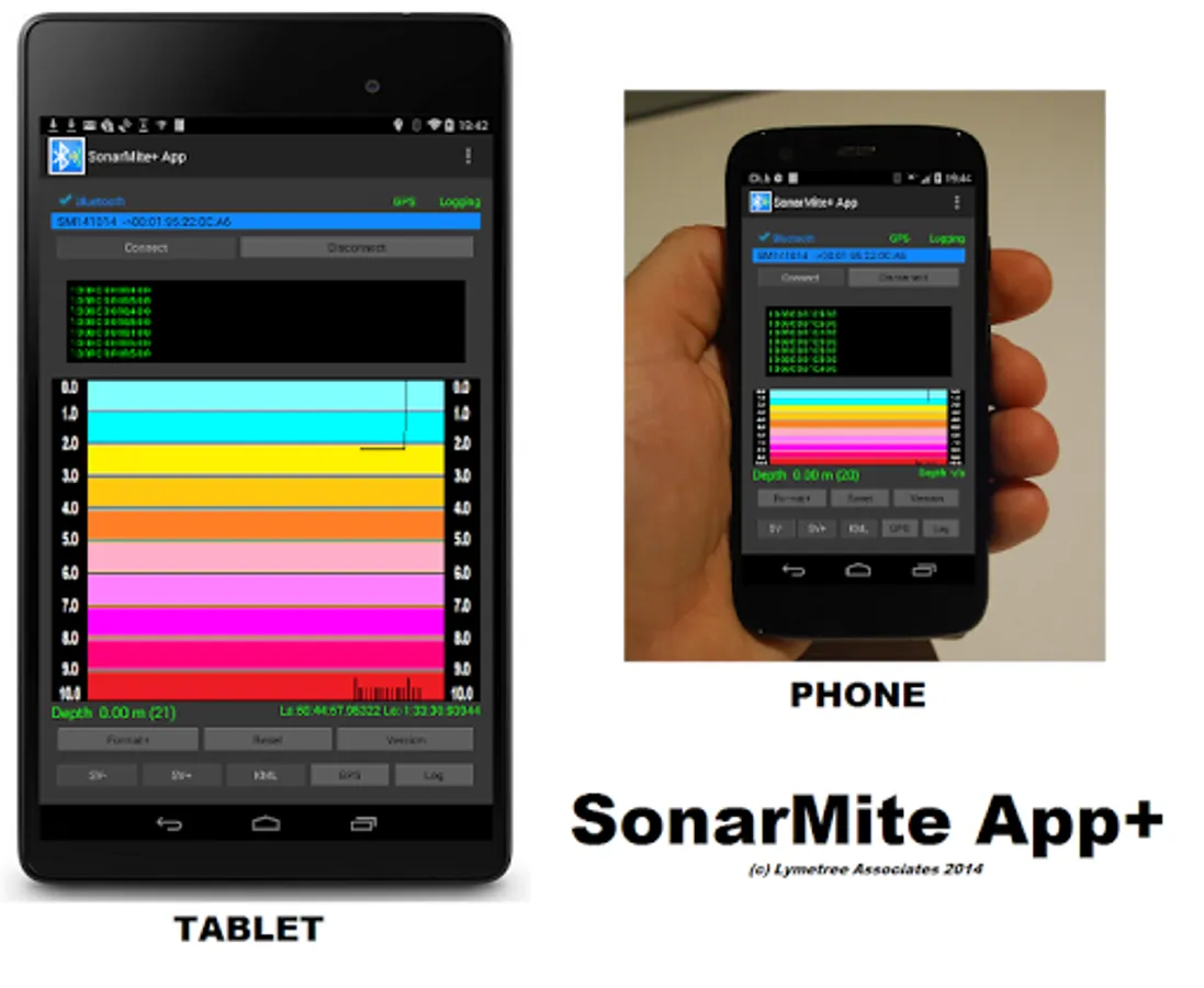 The SonarMite+ App is based on the free SonarMite App but offering additional features. The software is an Android App designed to work with the popular SonarMite Bluetooth Echo Sounder used in hydrographic surveying applications. With the demise of Hyperterminal as a standard terminal application the end user is left with little choice for a simple communications program with serial data devices. Connecting via Bluetooth is cleaner than USB cable, there are no wires and the connection is independent of baud rate and other serial port settings. Most terminal programs are not easily configured with commands to directly interface with instruments such as SonarMite.