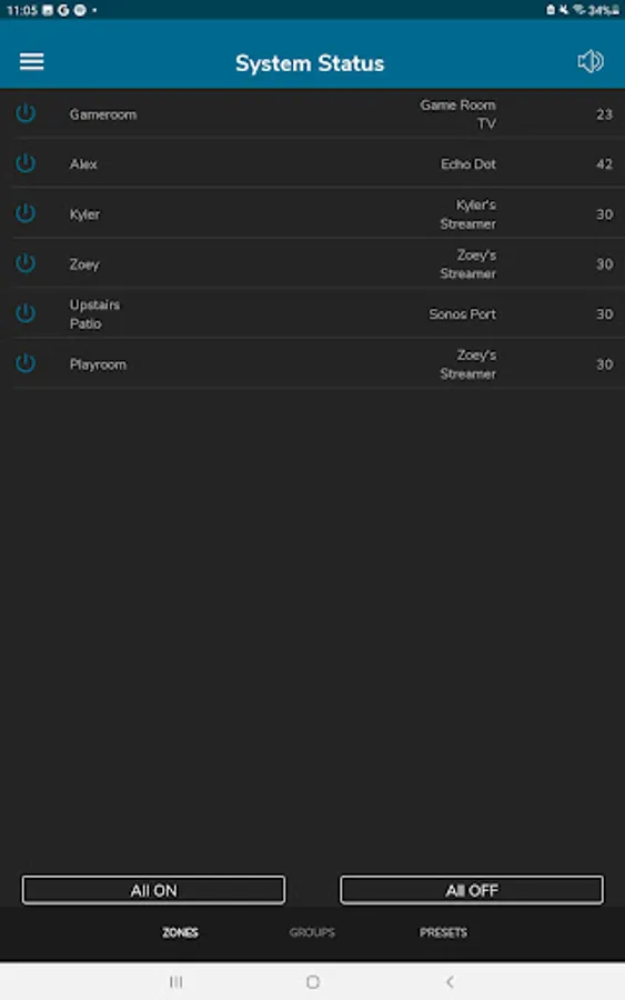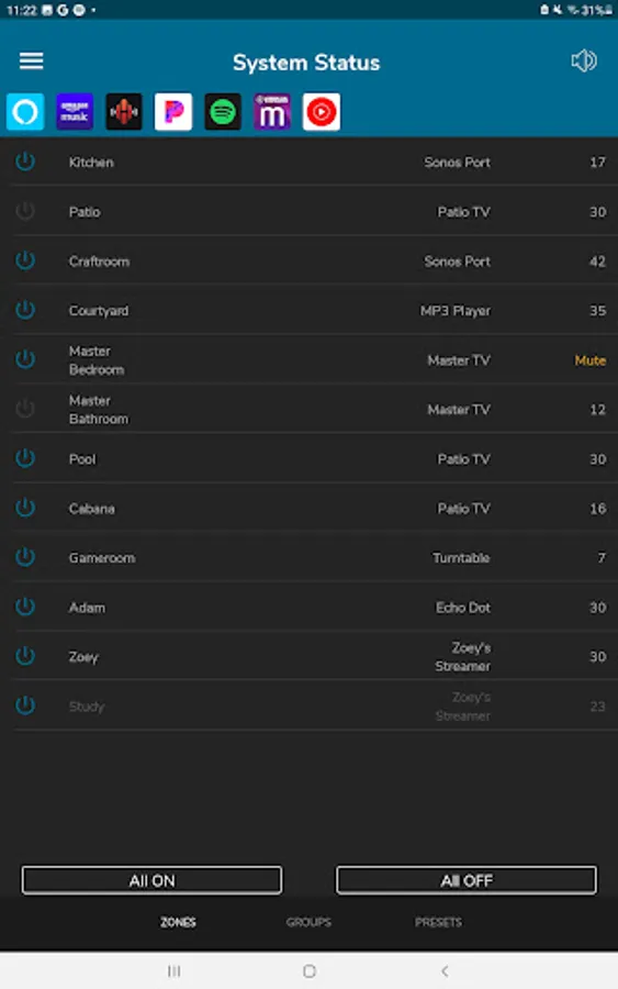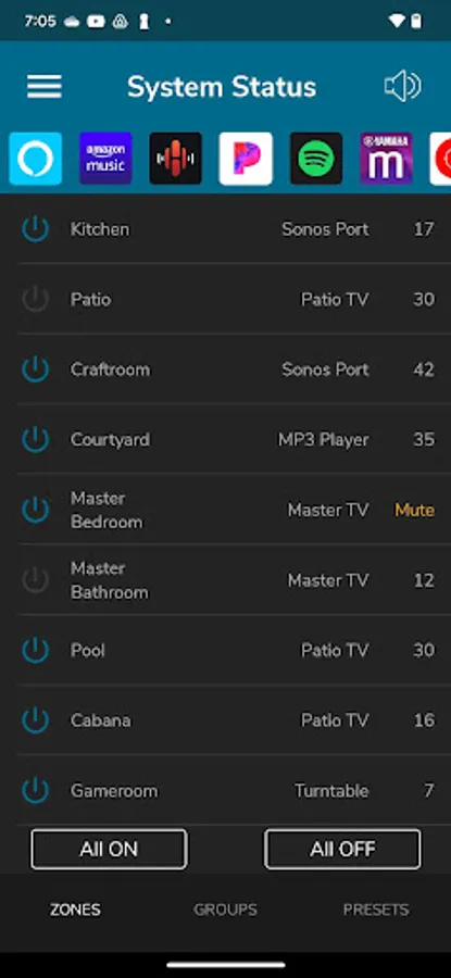 View and Control: The Home Audio app allows you to view and control all zones from a single system status page or drill down into each zone for more granular control. Control volume with both a scroll wheel and slide control. Mute and un-mute all zones with a single button press. Power off all zones with a single button press. Power on all zones to their previous state with a single button press. Power on all zones to a common source with party mode.
