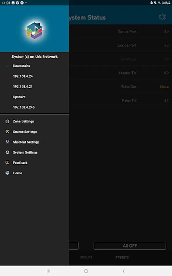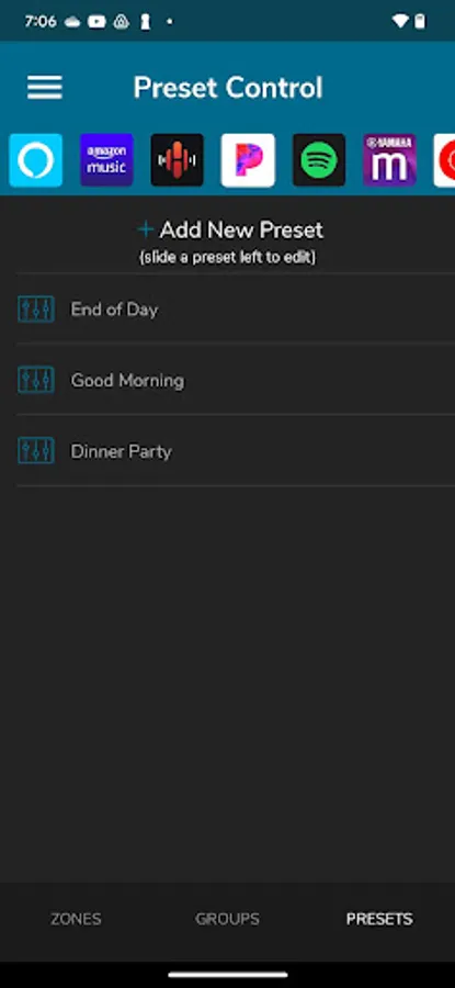 Presets: Create audio scenes called presets that set up multiple zones in your home with a single button press. For every zone set power on/off, source, volume, and DND (Do Not Disturb, Lync only).