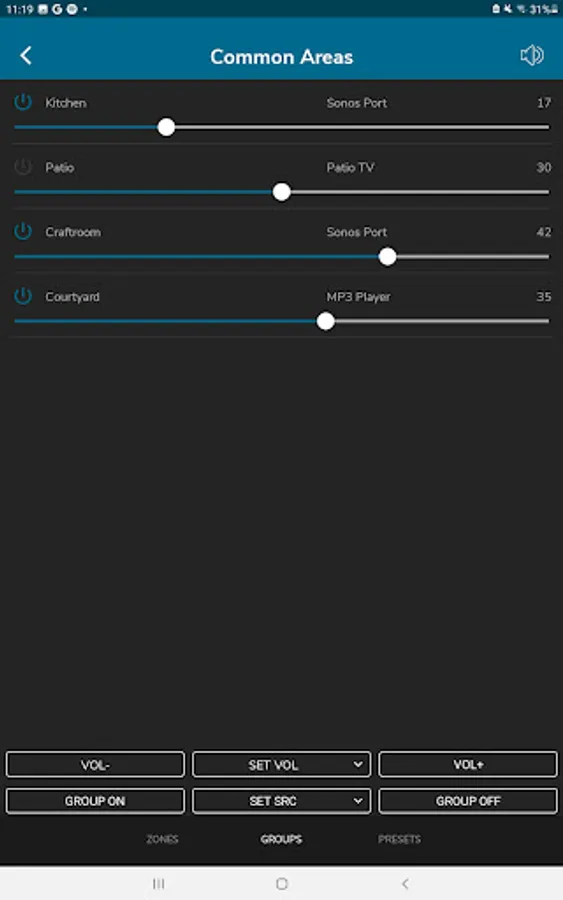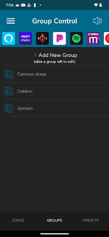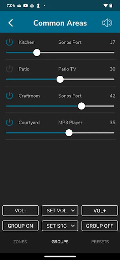 Zone Groups: Create groups of zones to set a common source, set a common volume, or relatively control volume across multiple zones.
