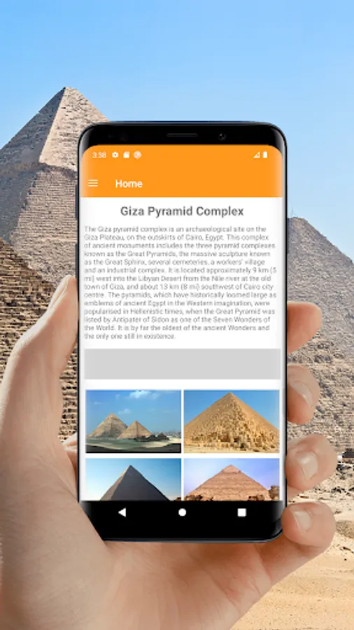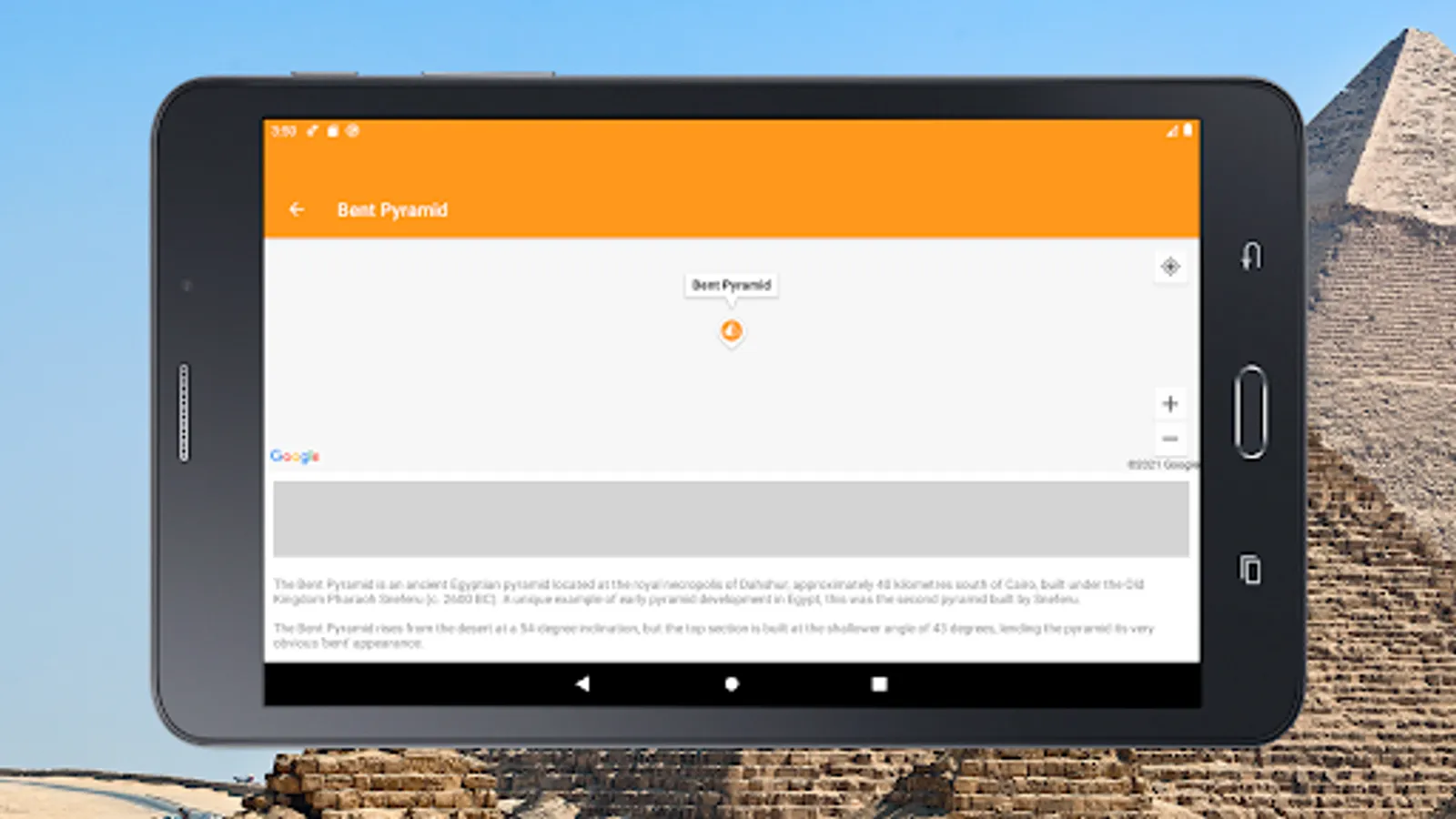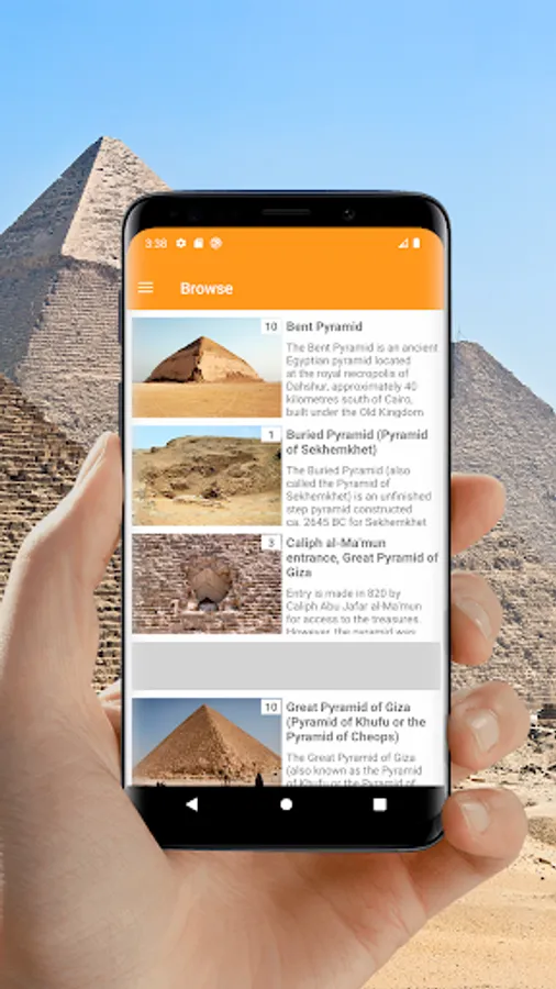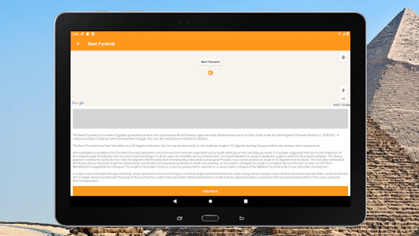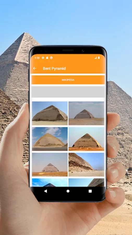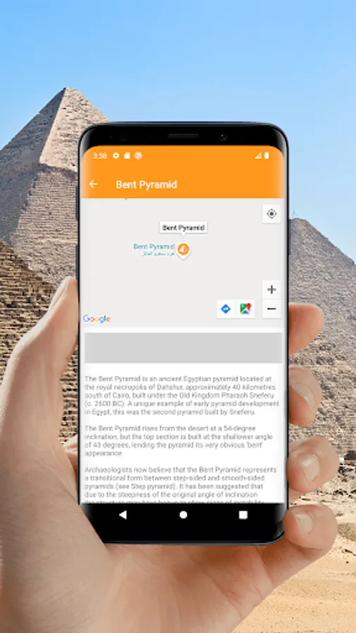 With our offline tourist travel guide you can easily navigate the Giza plateau and its surroundings. Study information about almost all the pyramids of Egypt and see photos. And if you are near, you will have no doubts what kind of pyramid is in front of you.