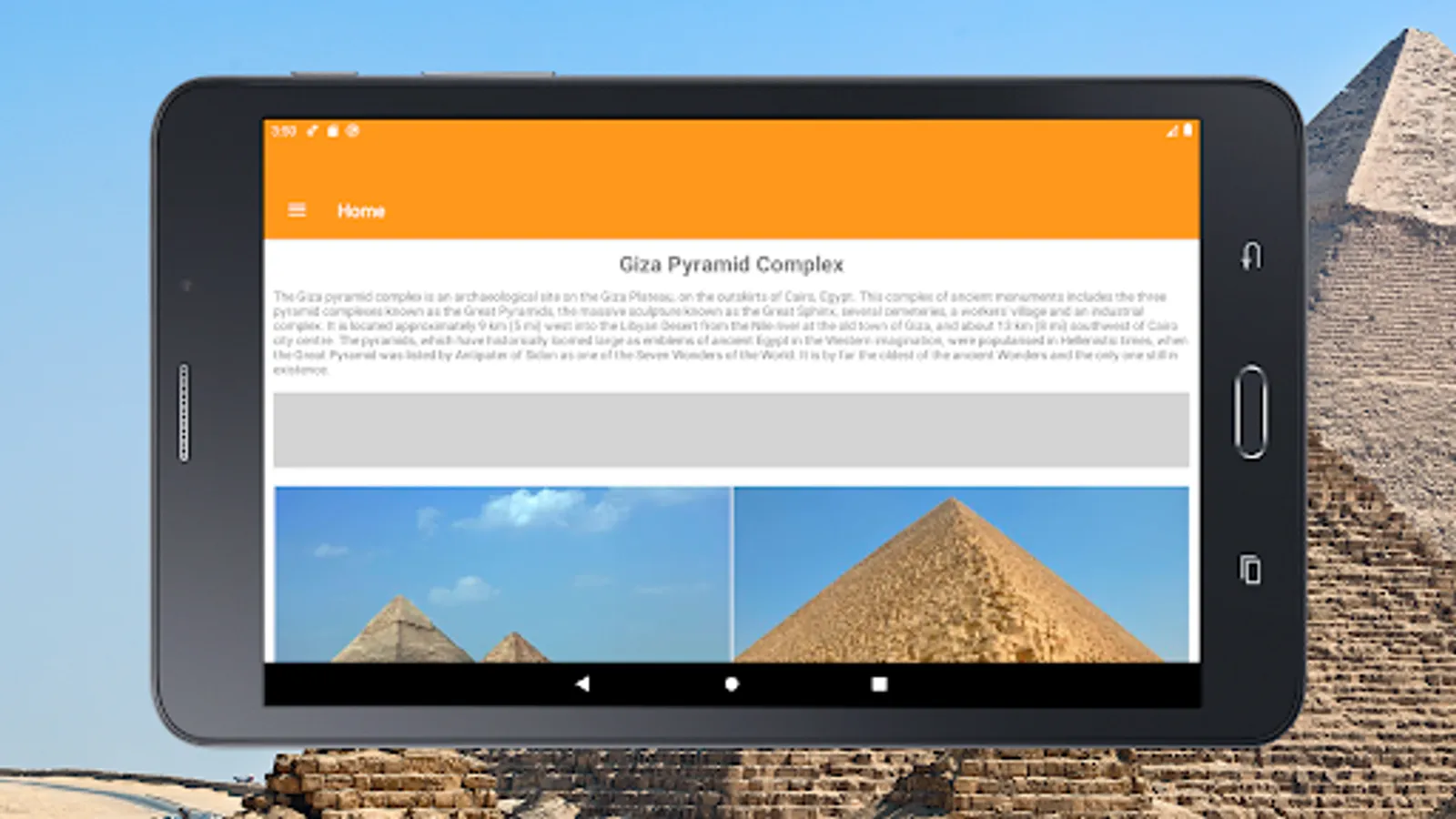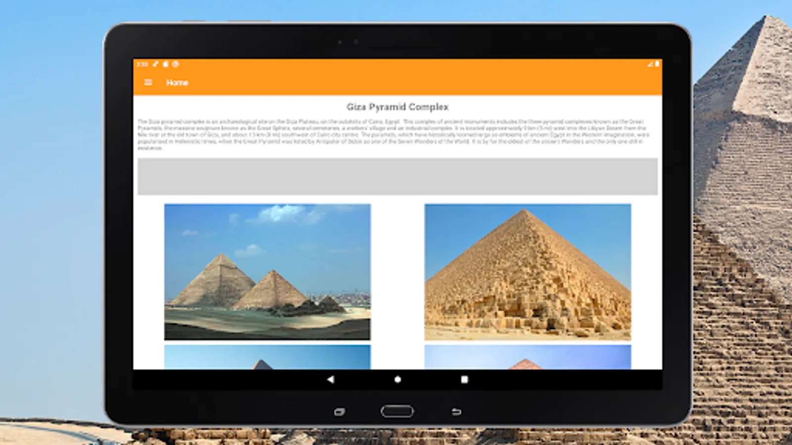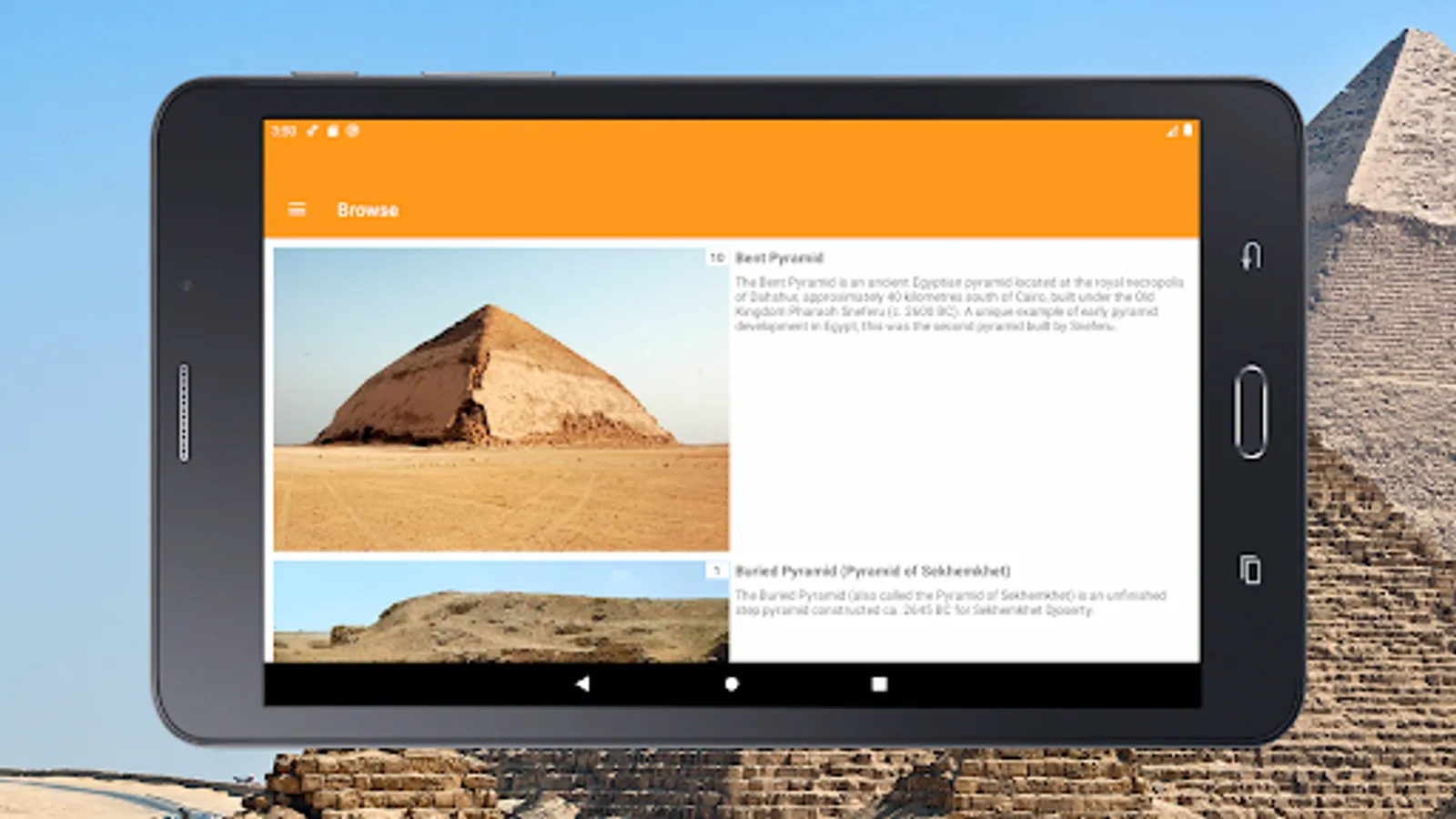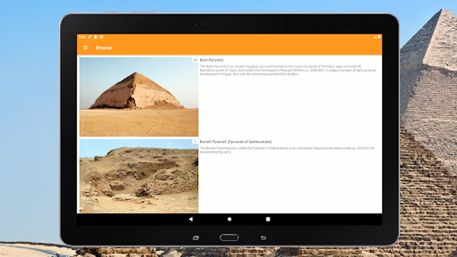 With our offline tourist travel guide you can easily navigate the Giza plateau and its surroundings. Study information about almost all the pyramids of Egypt and see photos. And if you are near, you will have no doubts what kind of pyramid is in front of you.