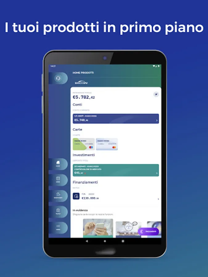 In the Home page you have an overview of your account balance, investments and financing. Furthermore, thanks to the payments button you can: