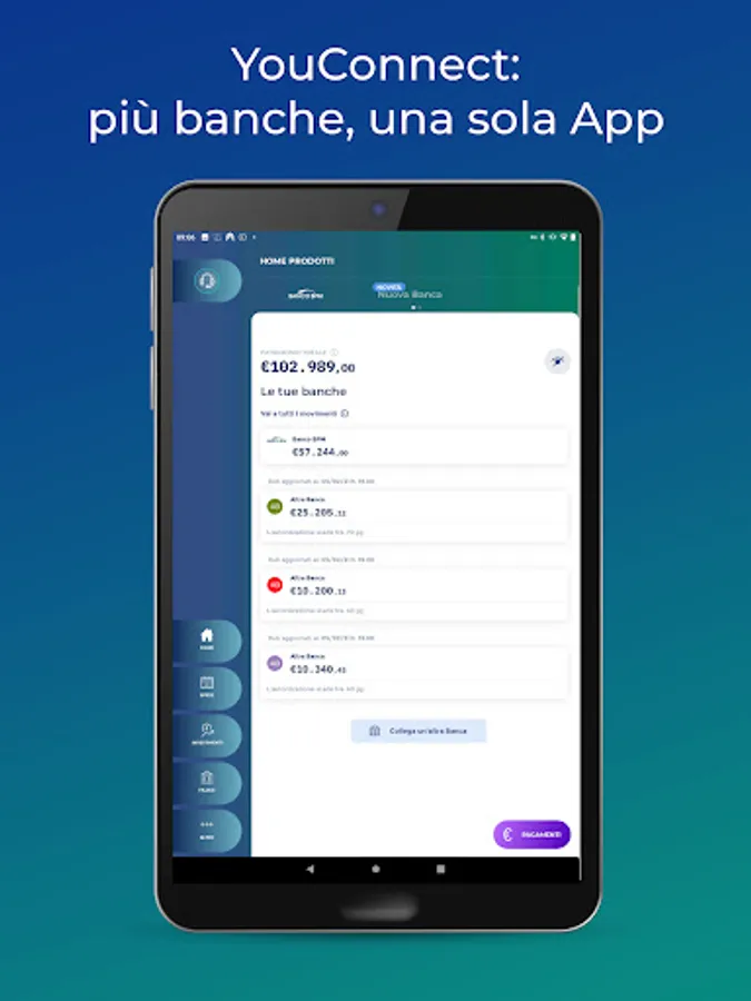 With YouConnect you also connect your current accounts and payment cards from other banks to Banco BPM mobile banking for an aggregate view of your balance and movements.