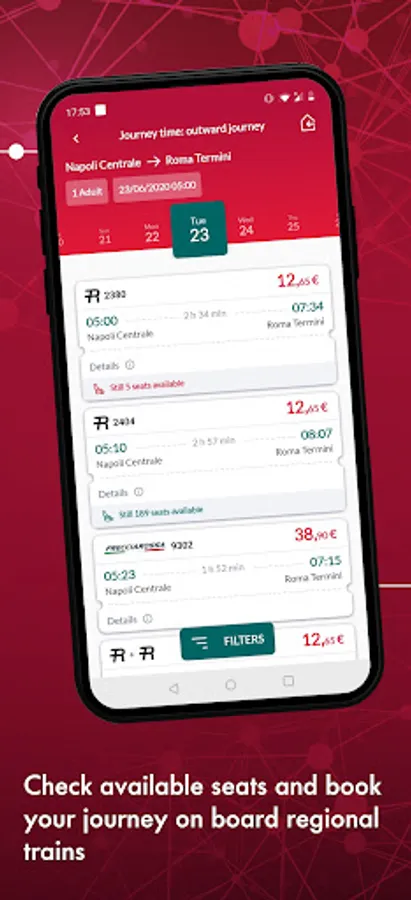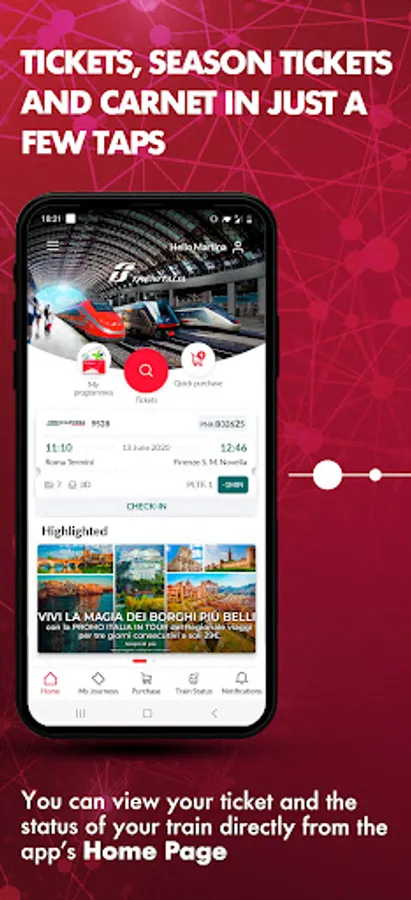 The Trenitalia App makes it simpler to plan your journeys. Purchase season tickets, carnets and other tickets for Frecce, Intercity, Regional, EC and EN trains in just a few clicks, as well as your tickets for Busitalia buses in Umbria and Veneto!