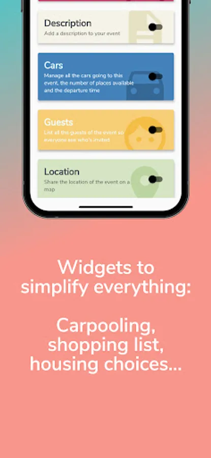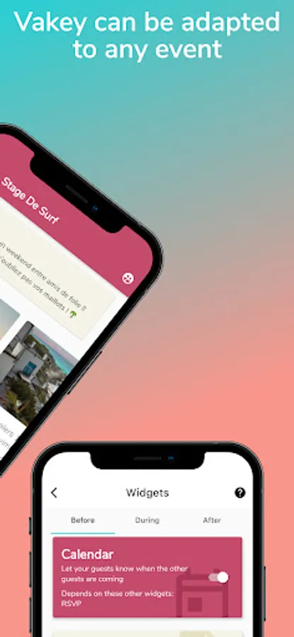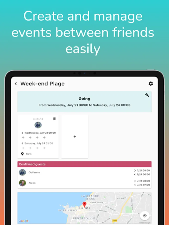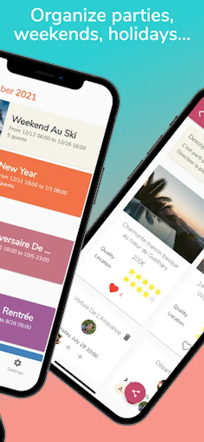 With Vakey, you no longer need several applications to manage your event. Free of charge, you can manage your guests, carpooling, accommodation to choose from, announcements, shopping lists, location, things to remember ...