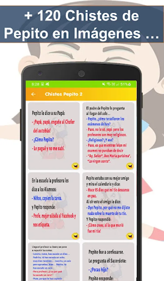 😁You have access to 120 Funny Pepito Jokes, varied and in Spanish, very easy to navigate, just have fun, we will continue to add more Pepito great Jokes for you.
