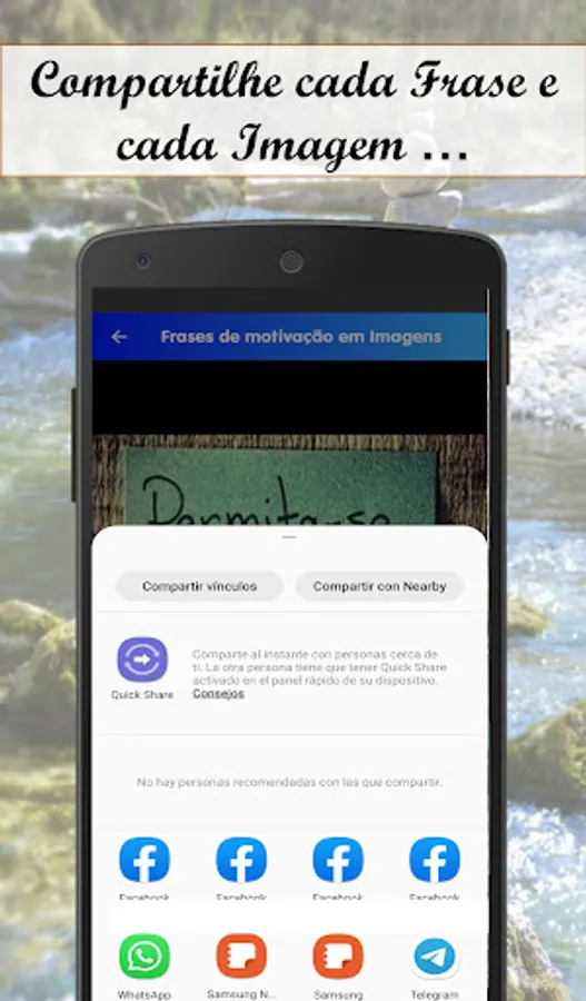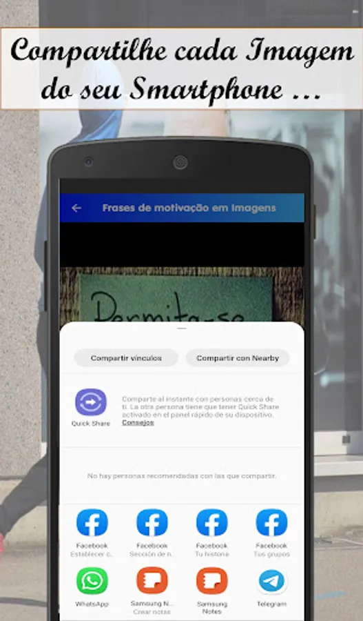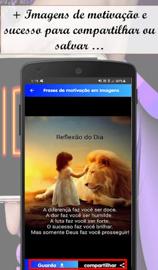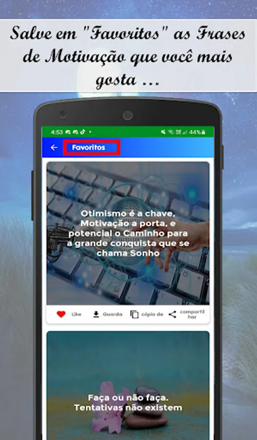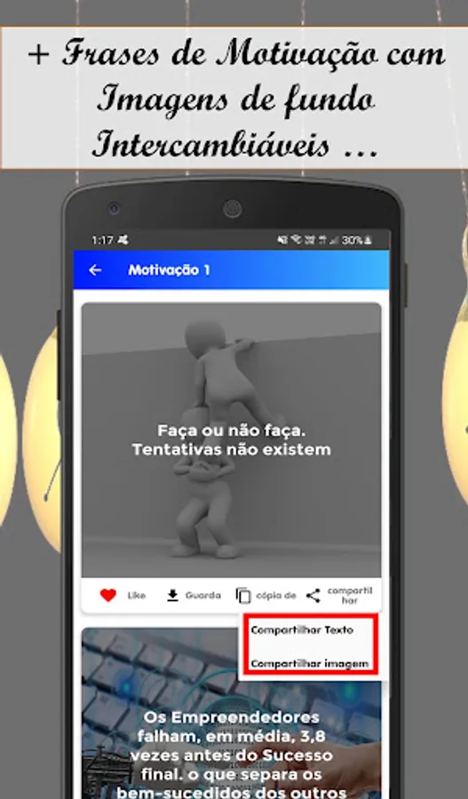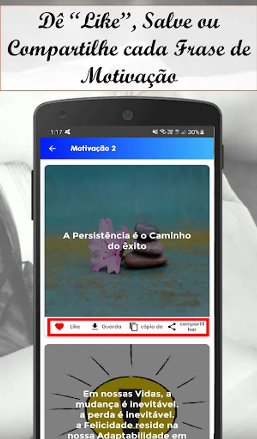 In Motivation, Success and Personal Improvement phrases, you can find an Extra function that will allow you to directly share the Image you like the most, through Social Networks, WhatsApp and Email. You will also find other functions that will allow you to share this Motivation and Success Phrases application through Wathapp and Email.