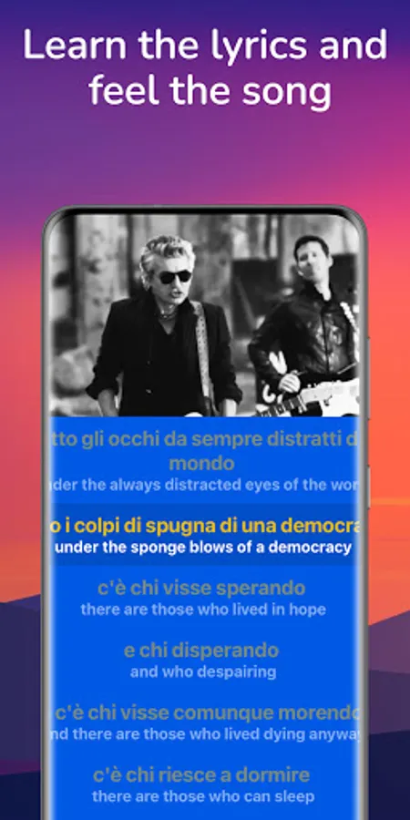 • karaoke mode. Let's you sing along while reading the translation of the lyrics in your mother language. Learn lyrics and understand the meaning of some of your favorite songs while learning languages.