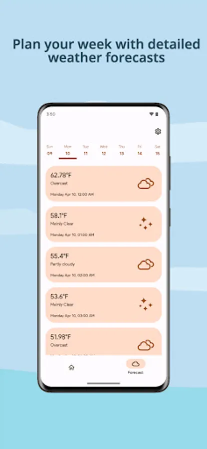 With our app, you'll get accurate weather information tailored to your location. We won't just show you the temperature - we'll give you detailed information about the current weather conditions and a forecast for the upcoming week, so you can plan your days with confidence.