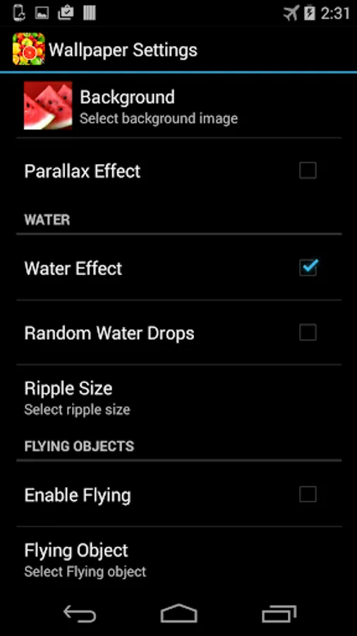 You can select different background image, enable/disable parallax and animation, select flying particles, enable or disable effect of water and virtual water drops, etc.