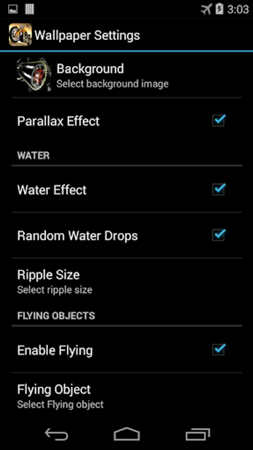 You can select different background image, enable/disable parallax and animation, select flying particles, enable or disable effect of water and virtual water drops, etc.