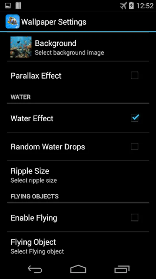 You can select different background image, enable/disable parallax and animation, select flying particles, enable or disable effect of water and virtual water drops, etc.