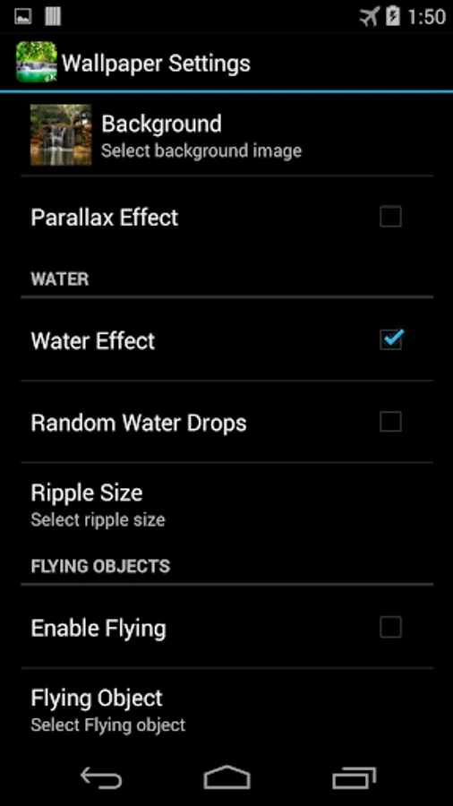 You can select different background image, enable/disable parallax and animation, select flying particles, enable or disable effect of water and virtual water drops, etc.