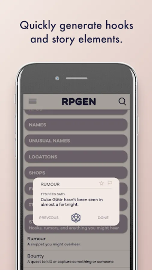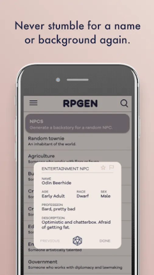 Quick! What's this NPC's backstory? In just a few taps, you can generate character details, location names, inventories, and much more without needing to pause the game.