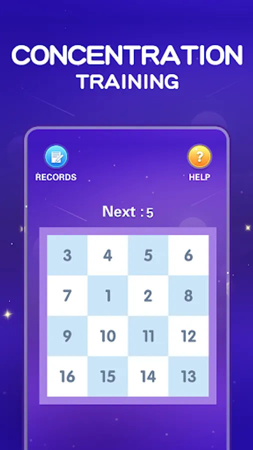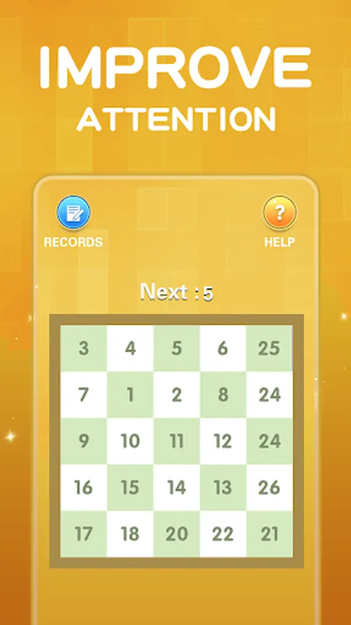 This is a Schulte Grid game. Players need to look at the numbers and tap on each number in ascending order. The shorter the time after all is finished, the higher the concentration.