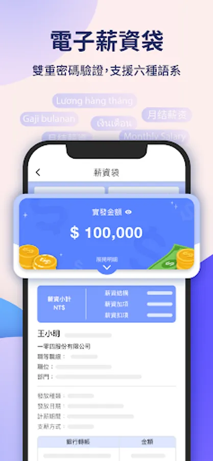Can use account password login and quick login (face value, fingerprint), with password lock and deactivation functions, and can browse monthly salary and bonus information in Traditional Chinese, Simplified Chinese, English, Indonesian, Thai, and Vietnamese.
