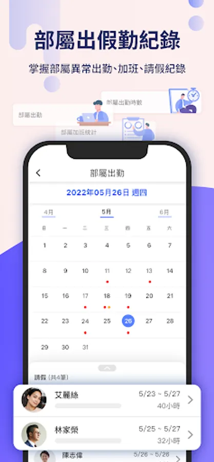Use the calendar to check whether there are abnormal attendance and leave status every day, and can query the overtime records, total overtime hours, and the corresponding total hours of compensatory leave and overtime pay for all employees in a specific area.