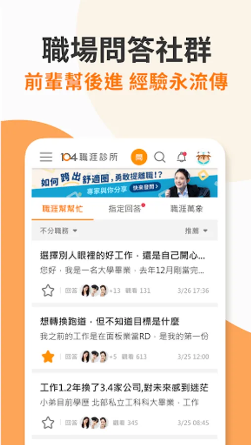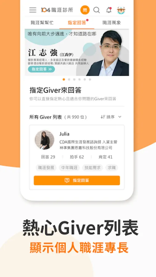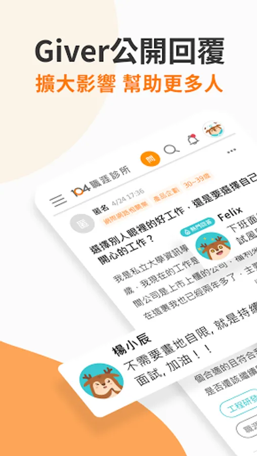 Most importantly, 104 Career Clinic continues the spirit of BeAGiver, adhering to the belief that "the seniors help the juniors, and the experience will be passed on forever", and provides a free online career Q&A platform. Through the sharing and exchange of workplace experience, we hope to help those who are confused on the career path find the next step and create a better workplace ecosystem!