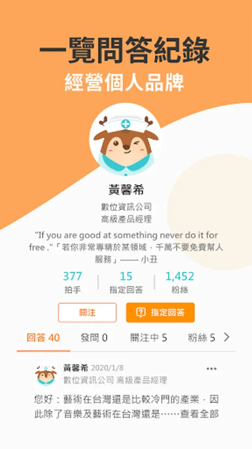 ●[Personal information page] displays records such as personal Q&A, number of fans, and number of affirmations, just like a personal brand page.